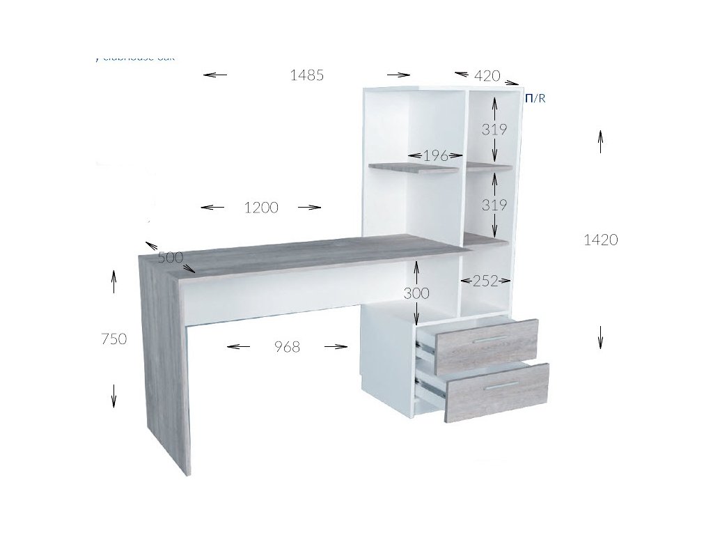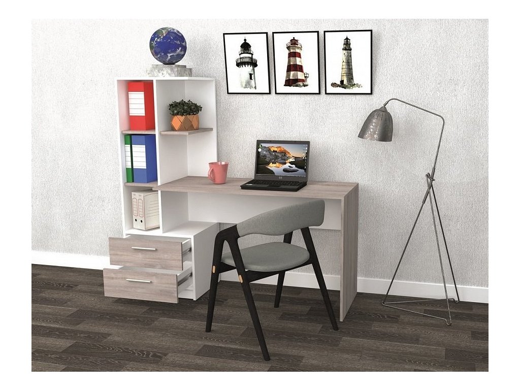 CASA 83098 Pracovní stůl se zásuvkami a regálem umístěným nalevo je proveden v jednoduché praktické linii, který se hodí do moderního interiéru. Korpus je vyroben z LTD desky odolné vůči poškrábání v kombinaci barev bílá/šedý dub (clubhouse). Výška desky pracovní plochy je 75 cm. Úchyty jsou plastové. Dodáváme v demontovaném stavu.