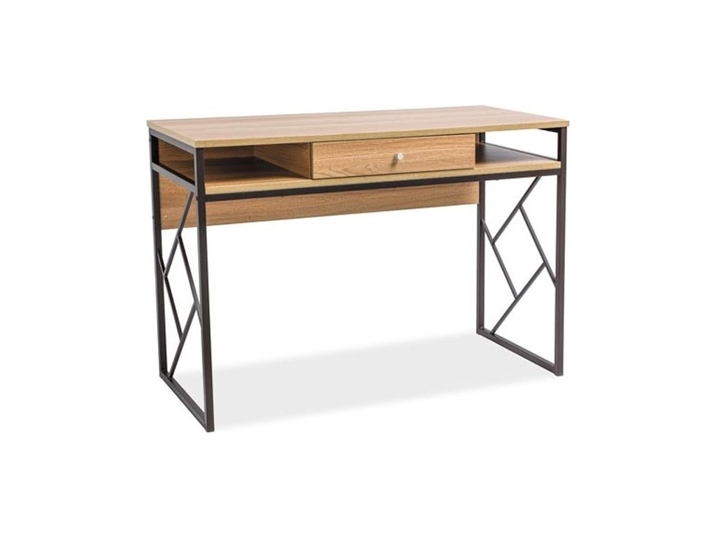 CASA 11716 Pracovní stůl ve stylu loft zaujme svým jednoduchým tvarem a bude ozdobou každého interiéru. Horní deska stolku je vyrobena z kvalitní MDF v barvě dub, rám stolku a boční část jsou z kovu tmavě hnědé barvy. Dodáváme v demontovaném stavu.