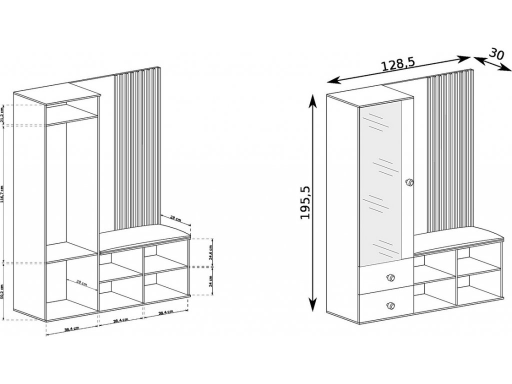 Sestava do předsíně s netradičním provedením detailu dvířek s lamelami. Kolekce nábytku v sobě spojuje jednoduchost, originální vzhled a funkčnost. Barevné provedení je v kombinaci dub artisan/černá mat. Nábytek je vyroben z kvalitního lamina ohraničeného ABS páskou, dekorační lamely jsou vyrobeny z desky MDF. Sestava se skládá z otevřeného botníku (nosnost 56-60 kg), věšákového panelu a šatní skříně se dvěma zásuvkami. Uvnitř skříně je police s výsuvným závěsem na ramínka, dveře jsou z přední strany doplněny zrcadlem. Kolekce se skládá z mnoha prvků a tento široký výběr Vám zaručí sestavit si nábytek podle svých vlastních představ a přání. Dodáváme v demontovaném stavu.
