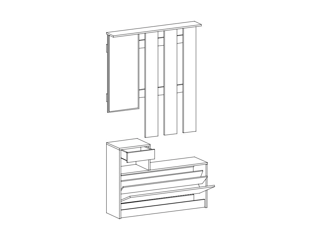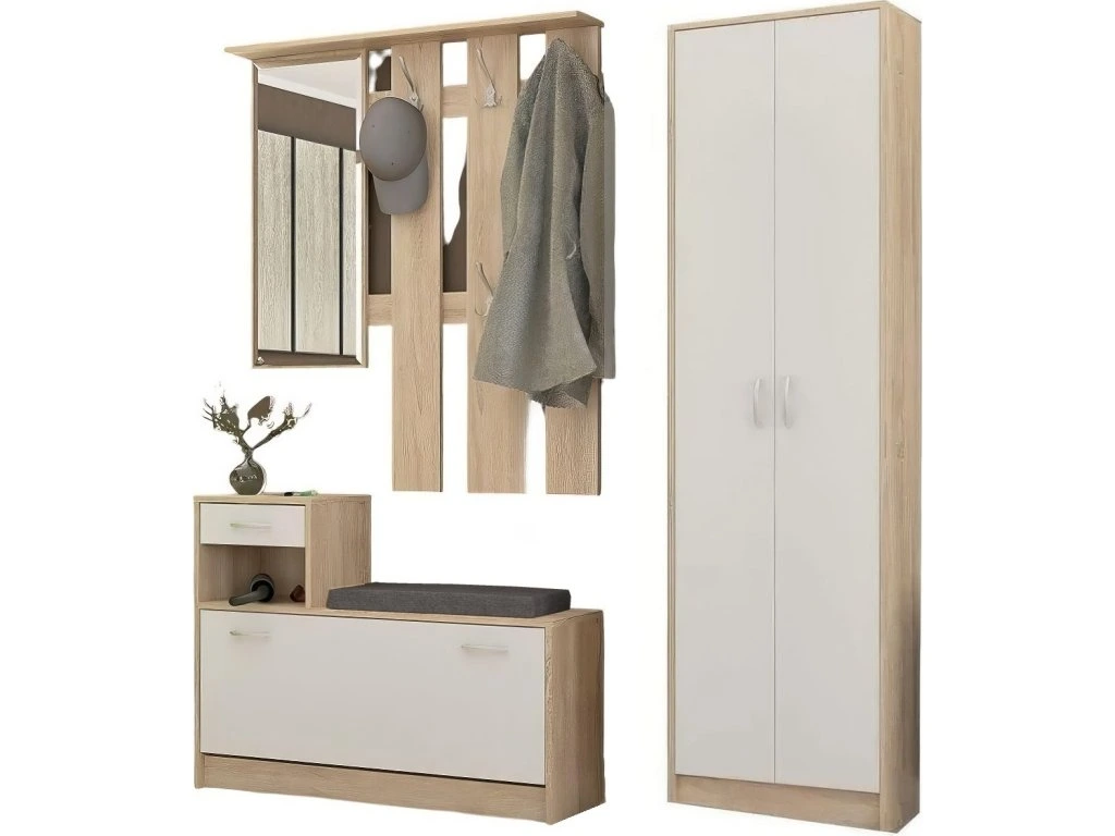 CASA 97010 Moderní předsíňová stěna se zrcadlem a skříní. Stěna je vyrobena z kvalitní laminátové desky v barevné kombinaci dub sonoma/bílá mat. Součástí stěny je věšáková stěna se zrcadlem a poličkou a malý výklopný botník s policí a zásuvkou (100x187x27,5 cm), šatní skříň (55,3x191x27,5 cm) a podsedákem (65x2x28 cm). Jednotlivé díli lze zakoupit zvlašť. Dodáváme v demontovaném stavu.