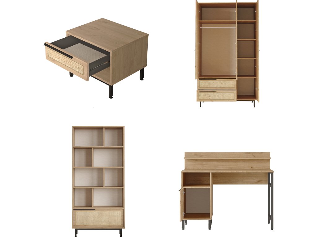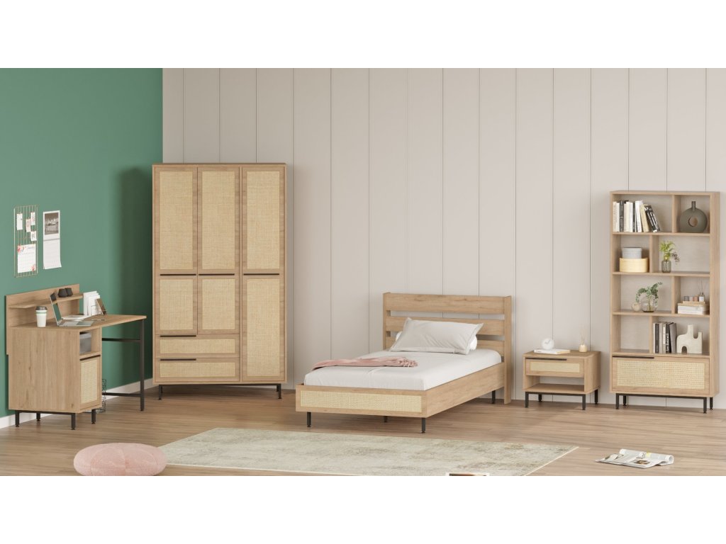 LONNY 24 kombinuje pohodlí a praktičnost. Postel poskytuje komfortní místo pro spánek, noční stolek je ideální pro lampičku nebo knihy, šatní skříň nabízí dostatek úložného prostoru pro oblečení a psací stůl zajišťuje ideální pracovní prostor pro studium nebo tvoření. Díky promyšlenému designu je tato sestava skvělým řešením pro organizovaný a stylový dětský pokoj.