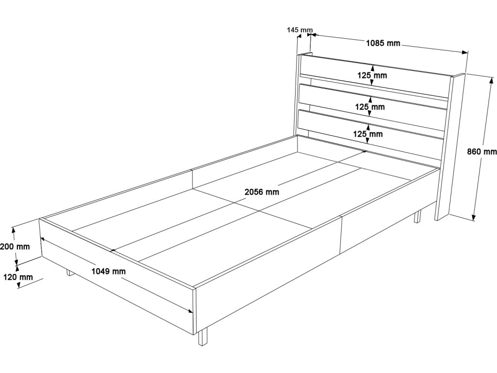 - Jednolůžková postel: 205,6 x 108,5 x 86 cm