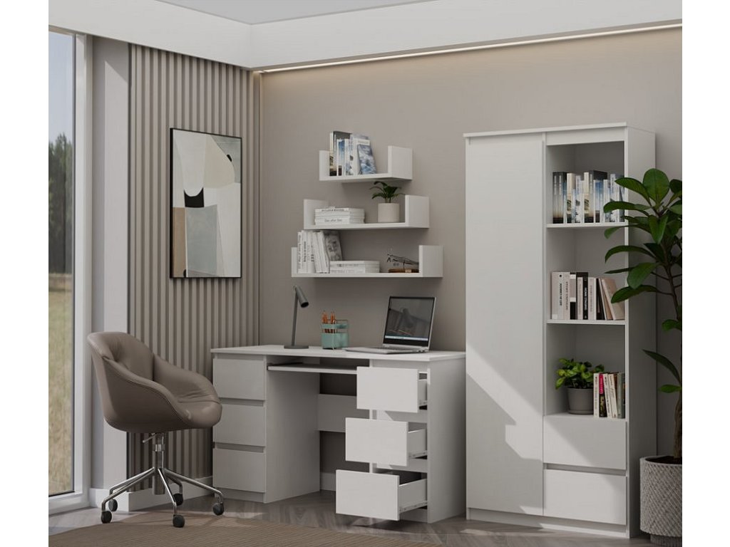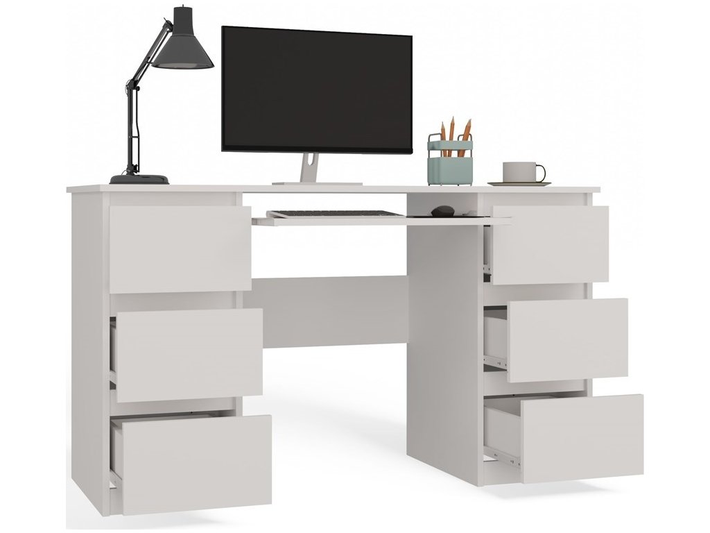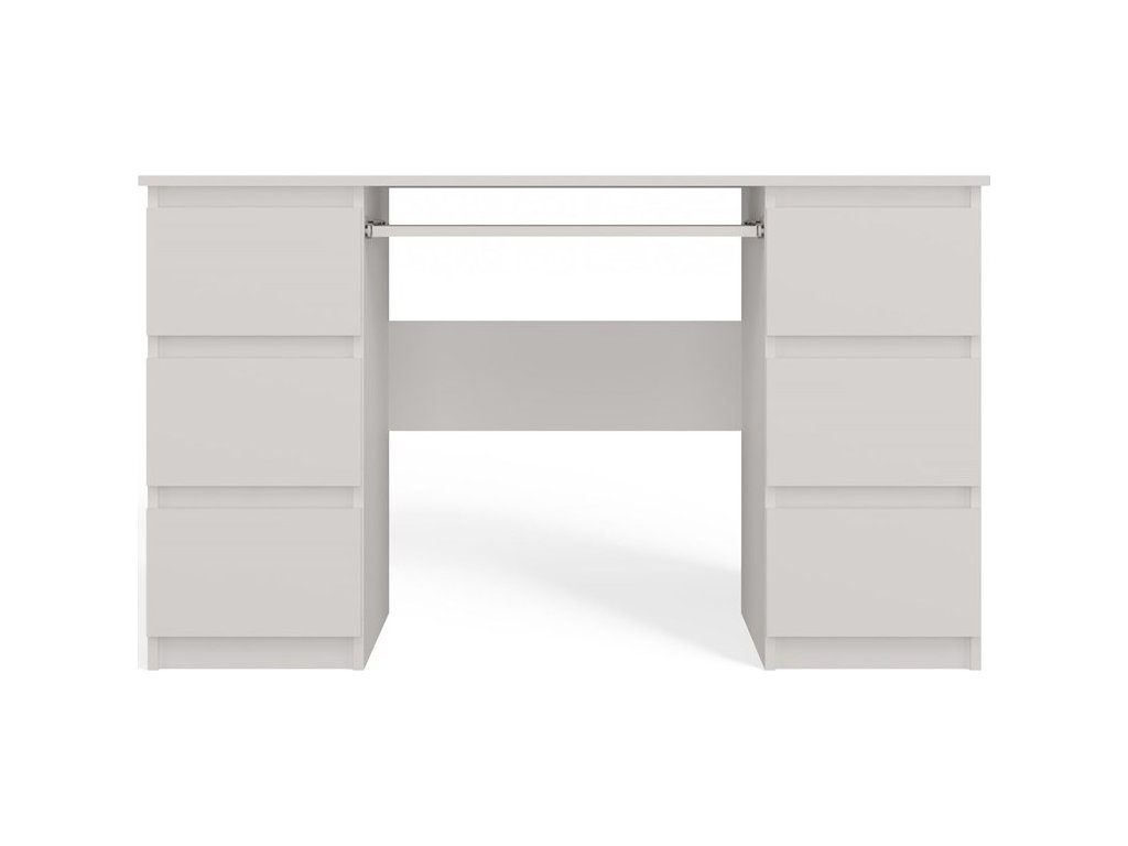 Funkční psací stůl Kima v jednoduchém a moderním designu poskytuje dostatečnou pracovní plochu a díky prostorným zásuvkám také spoustu úložného prostoru. Bezúchytková čela zásuvek zajistí pohodlné používání. Stůl je vyrobený ze snadno udržovatelného lamina, hrany jsou zakončené vysoce odolným ABS materiálem.