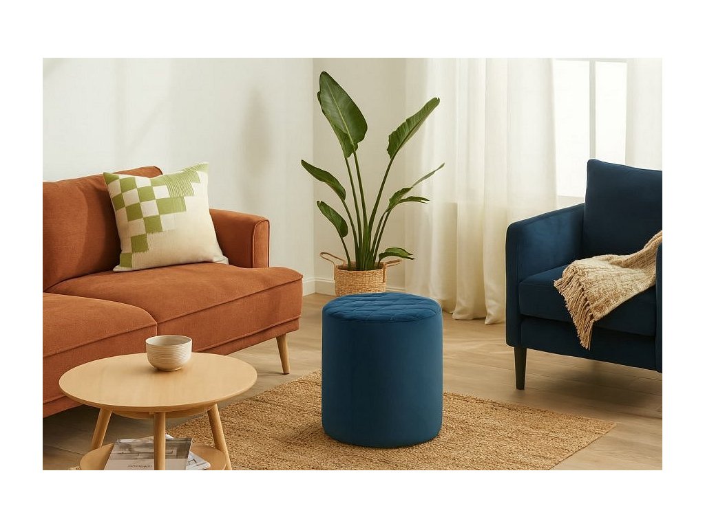 Elegantní kulatá taburetka čalouněná jemnou sametovou látkou v moderním odstínu tmavě modré barvy. Vrchní část sedáku je zdobena decentním prošíváním do kosočtverců, které dodává nábytku sofistikovaný vzhled. Díky kompaktním rozměrům je taburetka lehká, snadno přemístitelná a zároveň dostatečně stabilní pro každodenní použití.