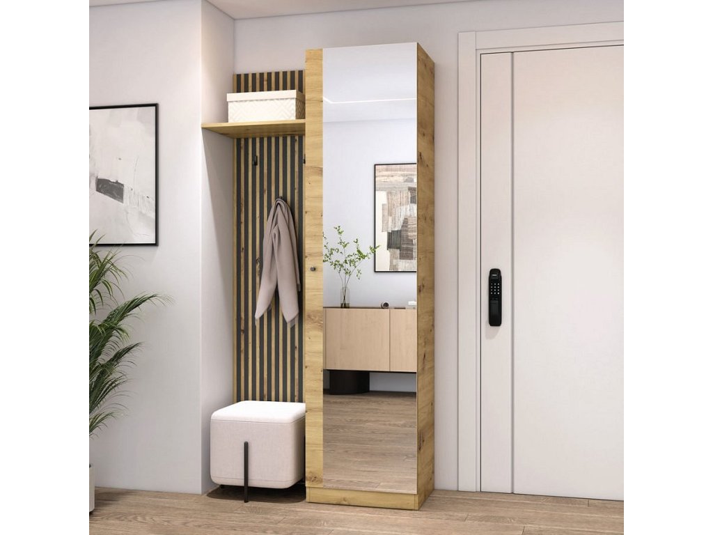 O stylový design Vaší vstupní části se postará moderní předsíňová sestava . Kombinace moderních barev jako dub Artisan v kombinaci s barvou antracit jí dodává jedinečný charakter. Designovým prvkem je zadní panel imitující trendové lamely. Za praktický rozměr sestavy jsou zodpovědné úložné prostory v podobě šatní skříně ve které se nacházejí 3 police. Snadný přístup ke kabátům zabezpečují věšáky, které jsou připevněny k zadnímu panelu.