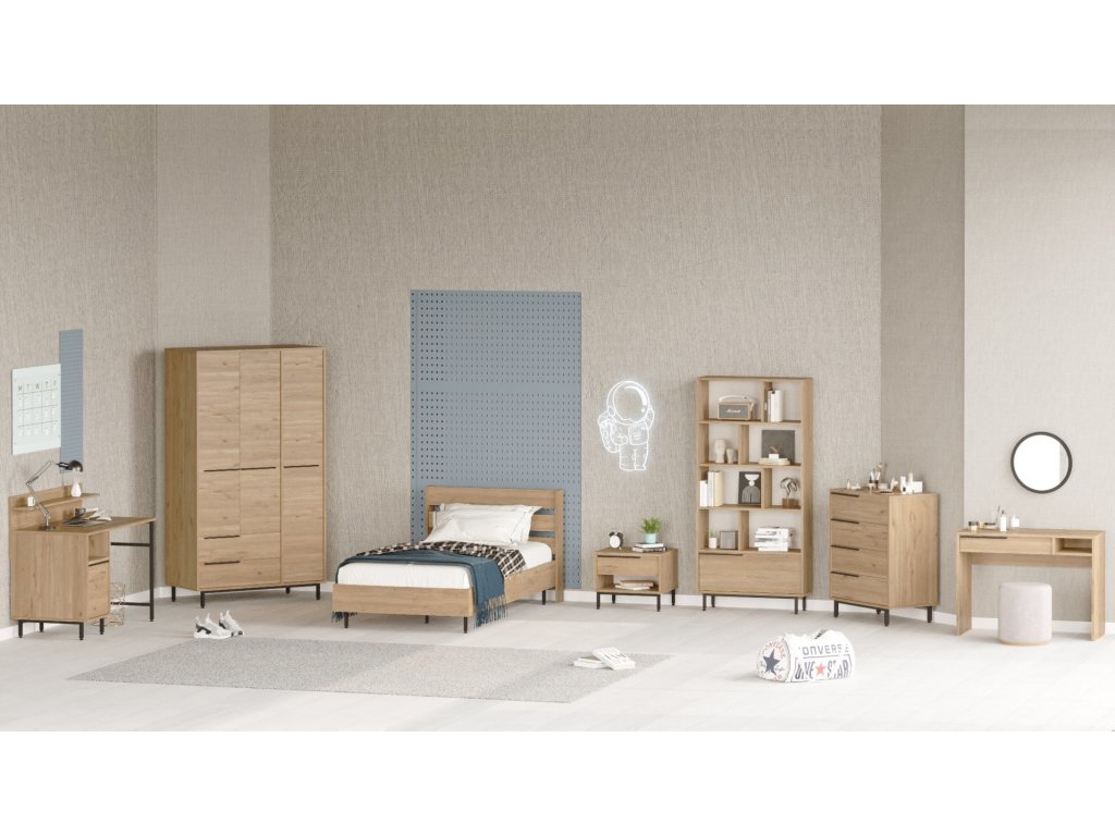 kombinuje pohodlí, praktičnost a styl. Postel nabízí komfortní místo pro spánek, noční stolek poskytuje prostor pro lampičku a knihy, šatní skříň zajistí dokonalou organizaci oblečení, psací stůl vytvoří ideální prostředí pro učení, knihovna nabídne prostor pro knihy a dekorace, a toaletní stolek dodává pokoji elegantní a praktický prvek pro osobní péči.