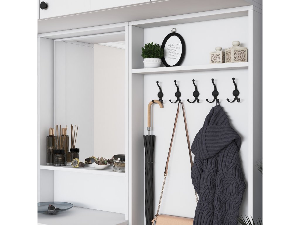 - Věšák: vhodný pro zavěšení tašek, šátků a často používaných oděvů.