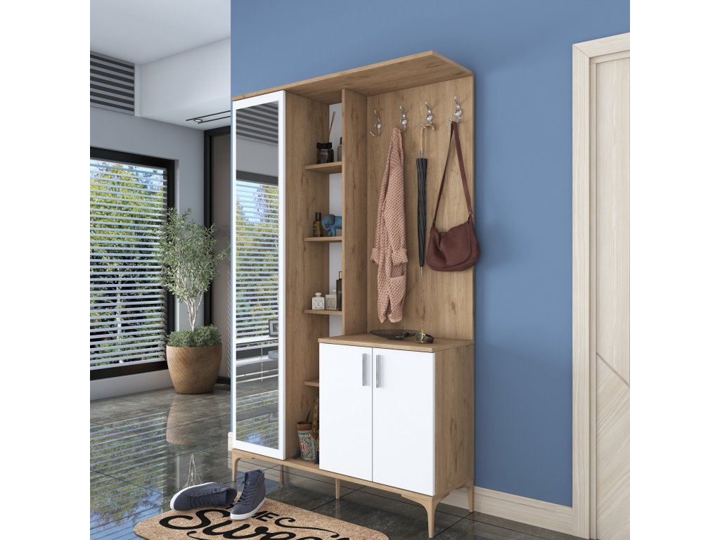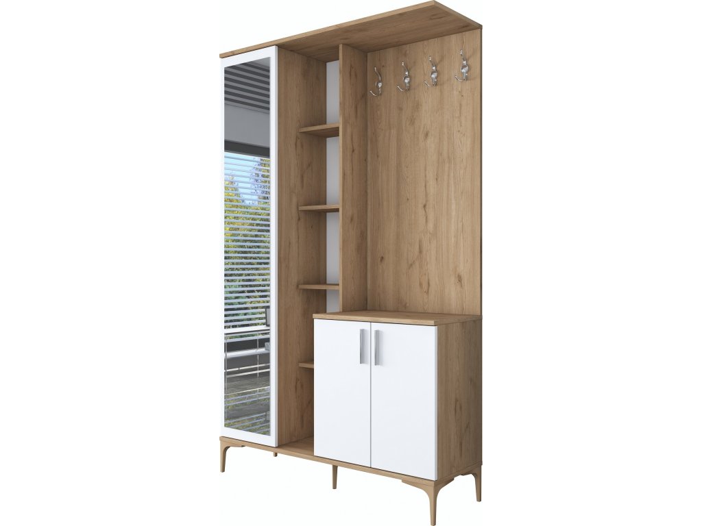 Součástí sestavy je vysoká skříň se zrcadlem, která opticky zvětší prostor a poskytne úložné místo pro oblečení a doplňky. Skříňka na boty vám pomůže udržet předsíň organizovanou, zatímco praktické věšáky zajistí snadný přístup ke kabátům, bundám a taškám.
