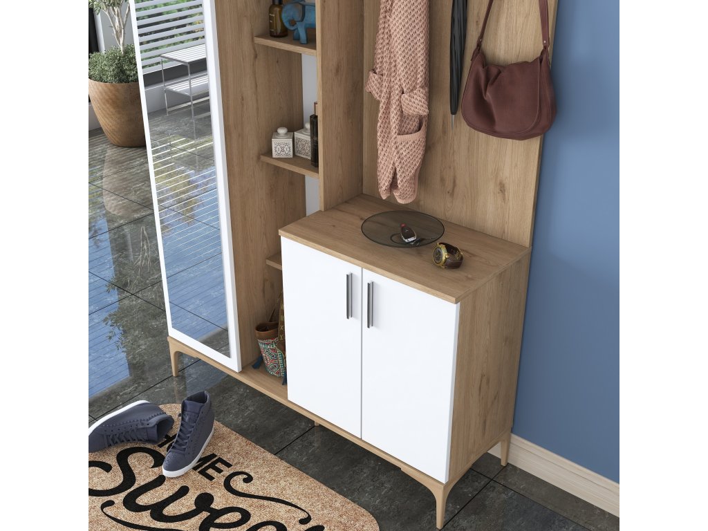 Předsíňová sestava kombinuje funkčnost a styl v jednom. Díky modernímu bílému provedení v kombinaci s ořechovým dekorem přináší do vaší předsíně sofistikovaný vzhled a zároveň dostatek úložného prostoru pro každodenní potřeby.