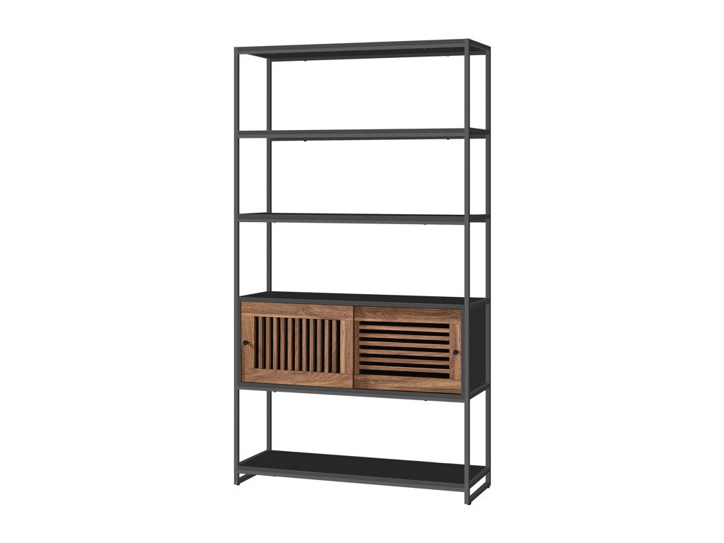 Regál s rozměry 100x35x180 cm kombinuje pevný kovový rám v černé barvě s policemi z MDF desek v odstínu Old wood, které dodávají nábytku přírodní vzhled. Kovové nosné vzpěry zajišťují stabilitu a dlouhou životnost celé konstrukce. Čtyři otevřené police nabízejí dostatek prostoru pro vystavení dekorací nebo uložení knih, zatímco spodní část je vybavena uzavíratelnou skříňkou s posuvnými dvířky s dekorativním lamelovým vzorem. Design regálu je moderní a zároveň funkční, vhodný do obývacích pokojů, pracovních prostor i komerčních interiérů.