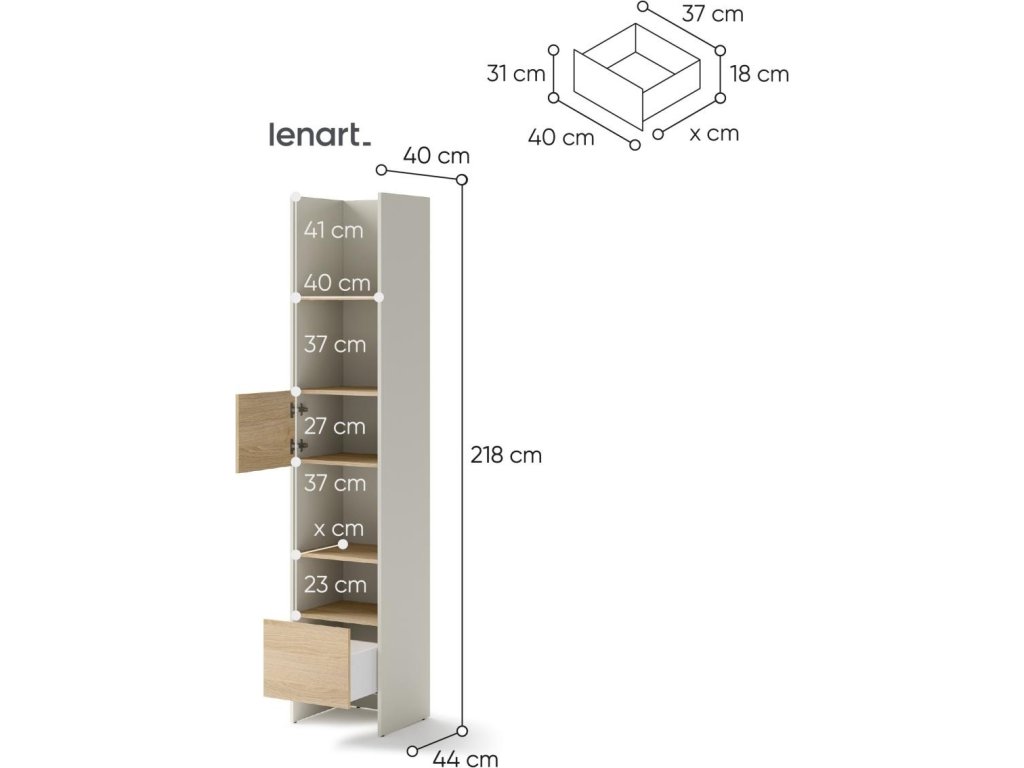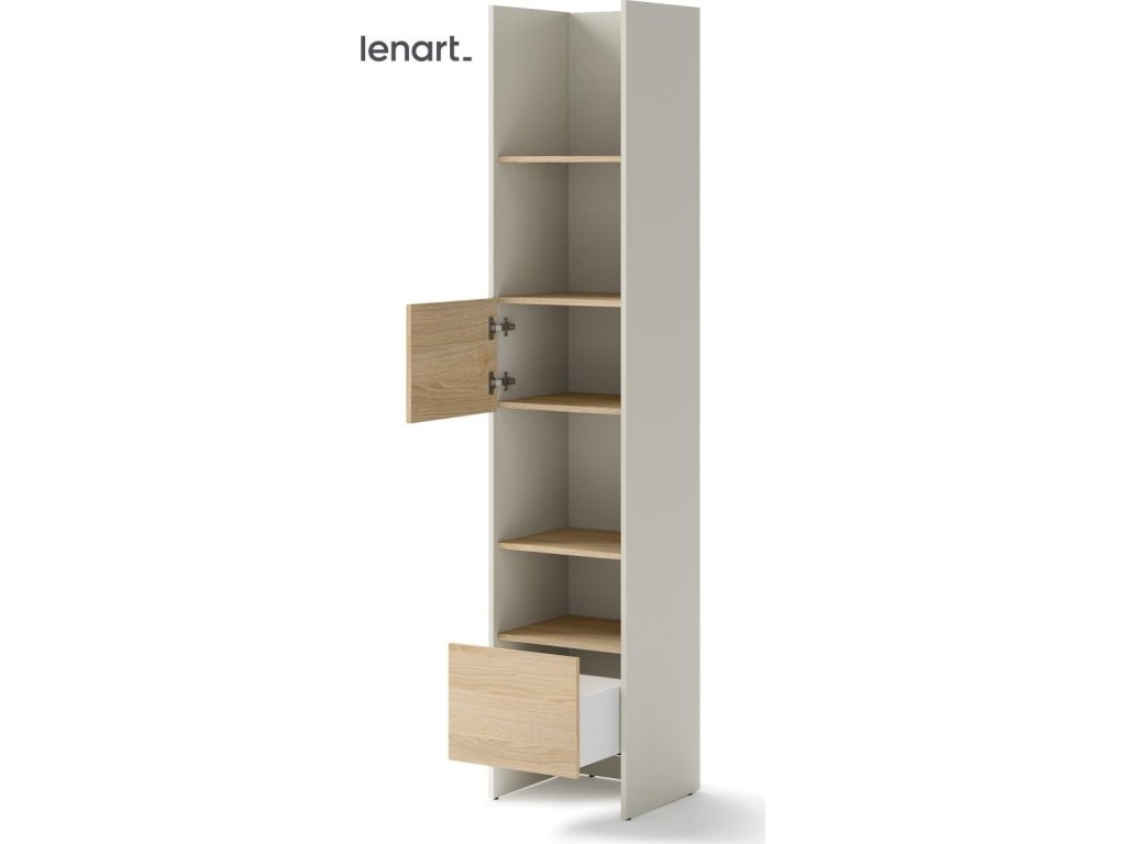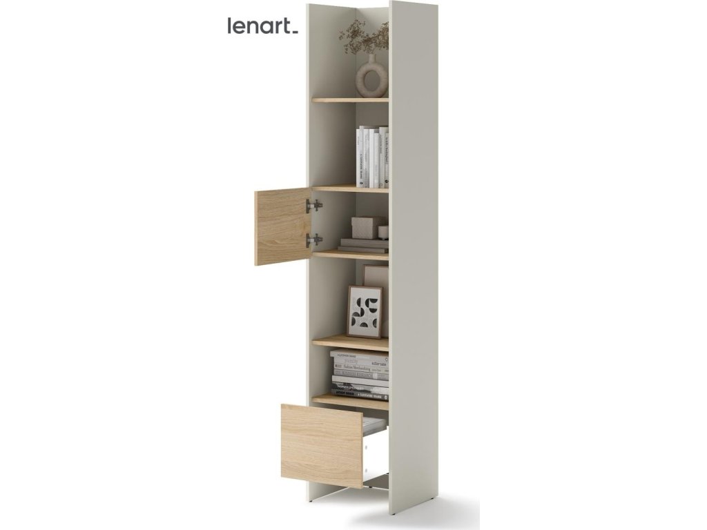 CASA 73026 Regál s dvířky a zásuvkou kašmír/dub nagano. Rozměry viz obrázek. Nábytek je vyroben z kvalitního lamina s ABS hranou. Lamino je odolné proti poškrábání, poškození, vlhkosti a vysokým teplotám. Dodáváme v demontovaném stavu.