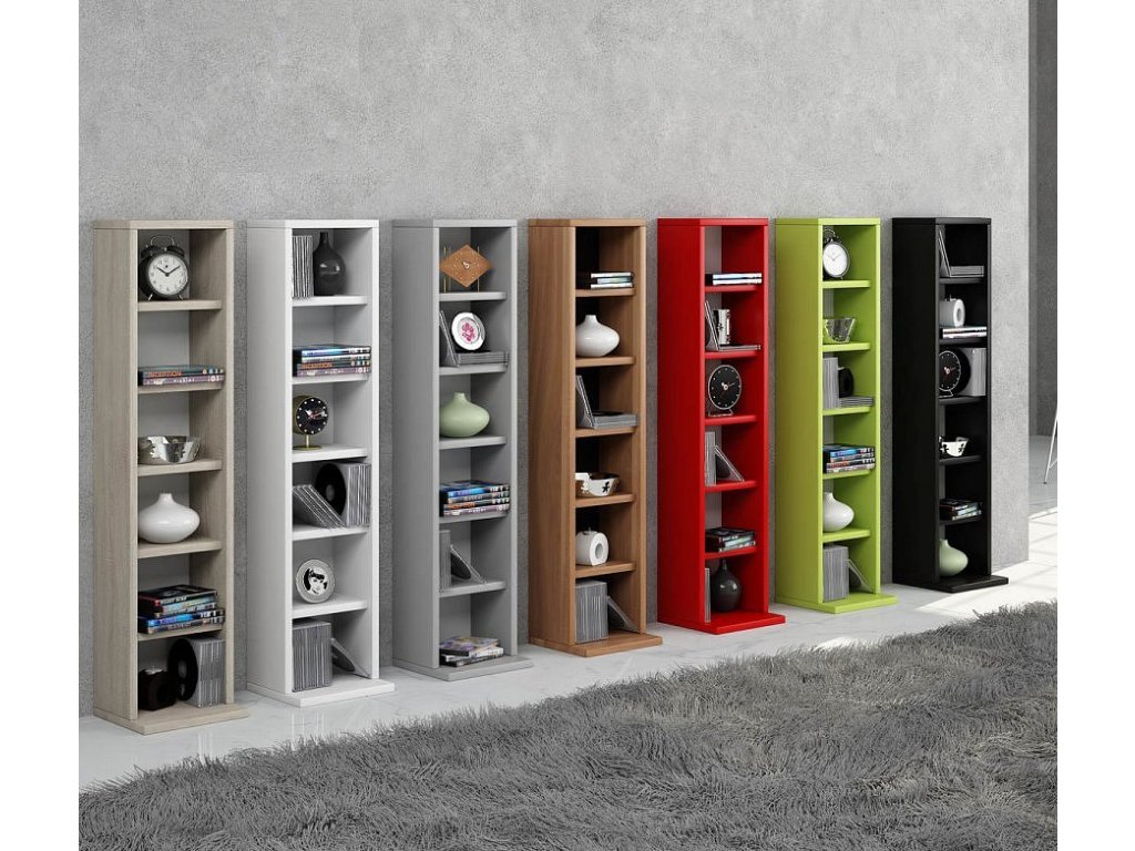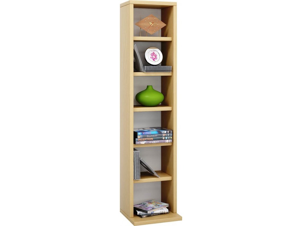 Úzký regál s 5 variabilními poličkami nabízí místo pro mnoho dekoračních i praktických věcí, především v něm ale uložíte až 102 CD, 36 DVD nebo 20 VHS. Prostor pak můžete dále zvětšovat díky tomu, že regály lze spojovat jednoduše k sobě (fixace na zadní straně).