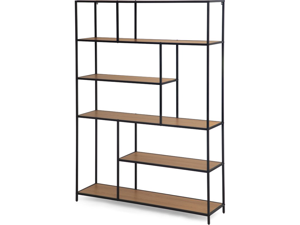 Praktický otevřený regál s kovovým rámem a policemi v dekoru přírodního dřeva nabízí funkční úložný prostor s odlehčeným vzhledem. Díky asymetrickému rozložení polic působí zajímavě a zároveň poskytuje místo pro knihy, dekorace nebo doplňky.