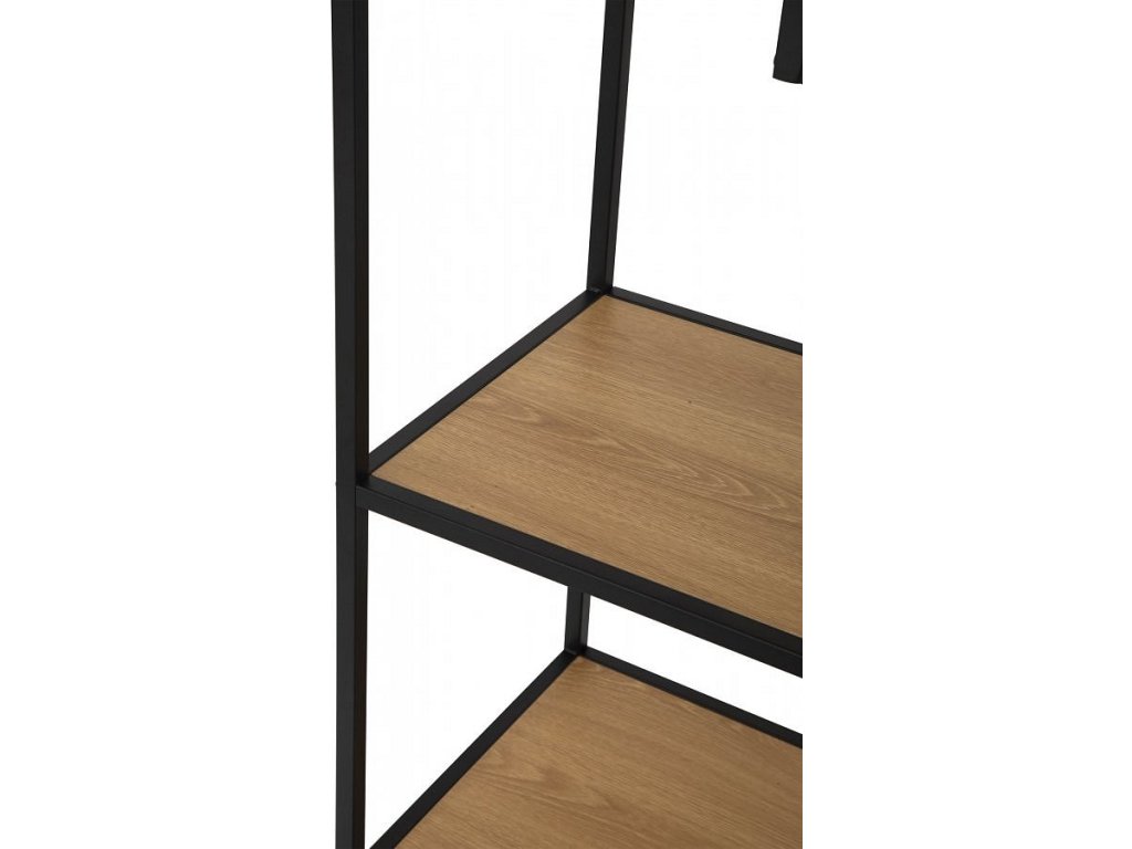 Černá kovová konstrukce zajišťuje stabilitu, zatímco laminované police jsou snadno udržovatelné a odolné vůči běžnému používání. Regál se hodí do obývacího pokoje, pracovny nebo vstupního prostoru.