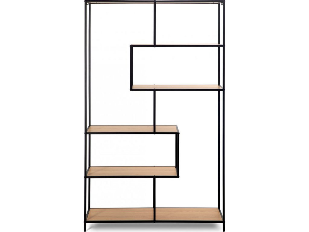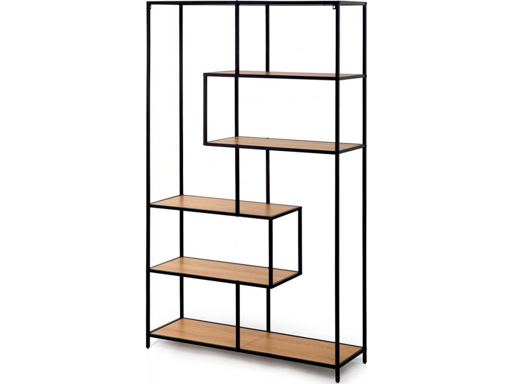 Praktický otevřený regál s kovovým rámem a policemi v dekoru přírodního dřeva nabízí funkční úložný prostor s odlehčeným vzhledem. Díky asymetrickému rozložení polic působí zajímavě a zároveň poskytuje místo pro knihy, dekorace nebo doplňky.