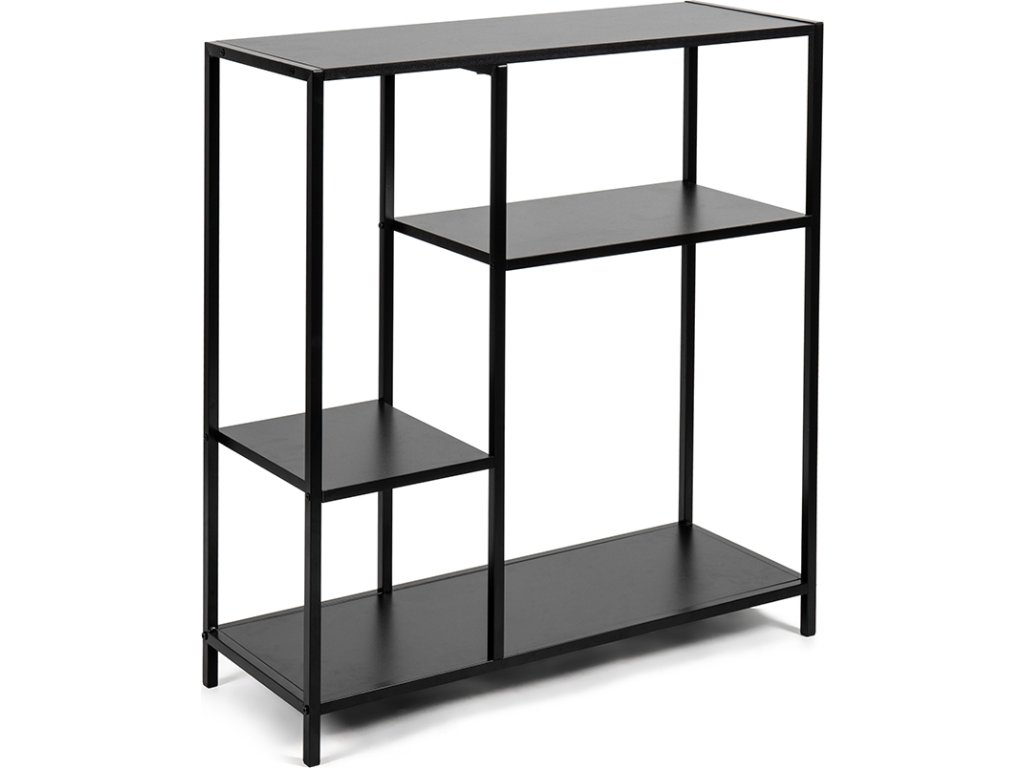Praktický otevřený regál s kovovým rámem a policemi nabízí funkční úložný prostor s odlehčeným vzhledem. Díky asymetrickému rozložení polic působí zajímavě a zároveň poskytuje místo pro knihy, dekorace nebo doplňky.