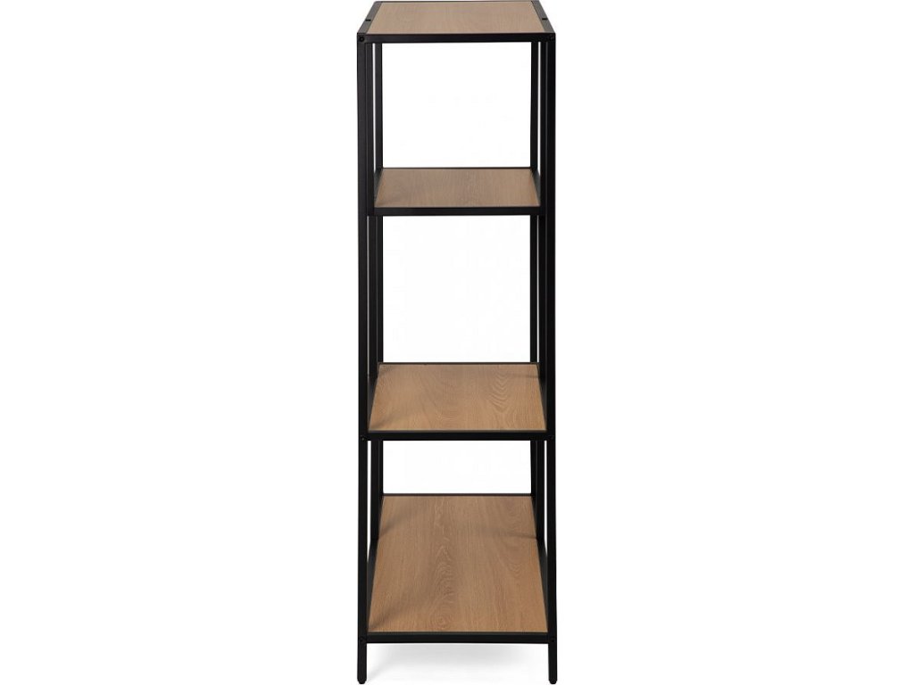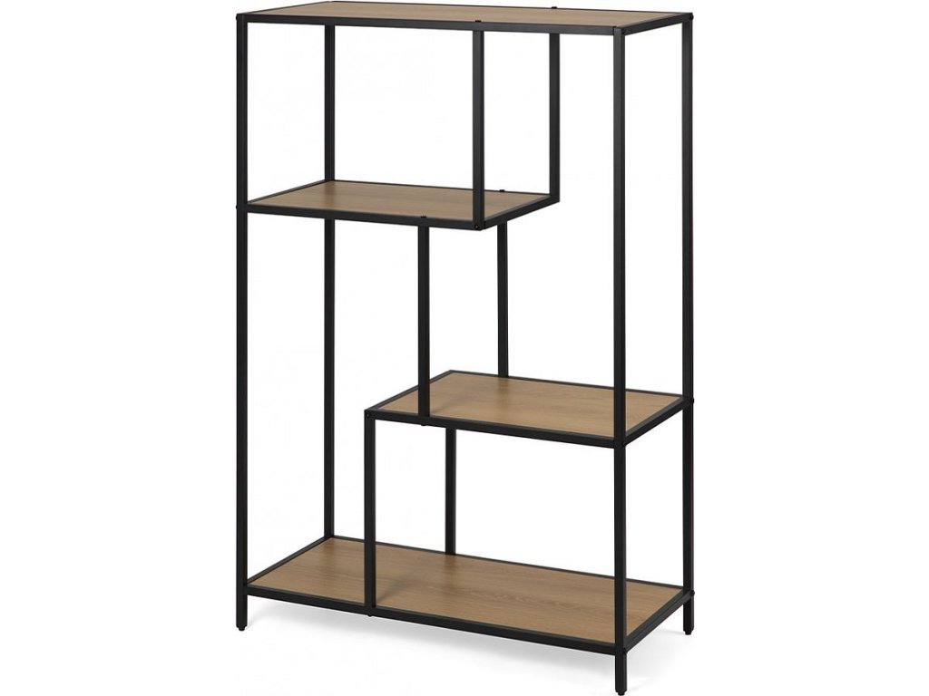Praktický otevřený regál s kovovým rámem a policemi v dekoru přírodního dřeva nabízí funkční úložný prostor s odlehčeným vzhledem. Díky asymetrickému rozložení polic působí zajímavě a zároveň poskytuje místo pro knihy, dekorace nebo doplňky.