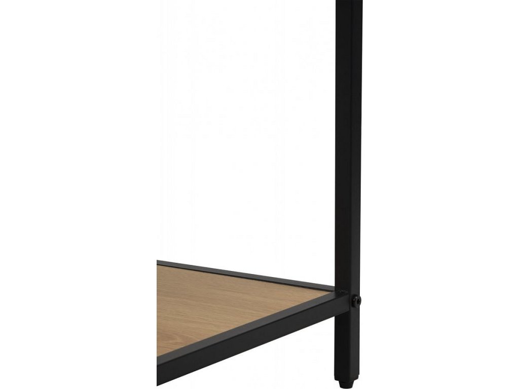 Černá kovová konstrukce zajišťuje stabilitu, zatímco laminované police jsou snadno udržovatelné a odolné vůči běžnému používání. Regál se hodí do obývacího pokoje, pracovny nebo vstupního prostoru.