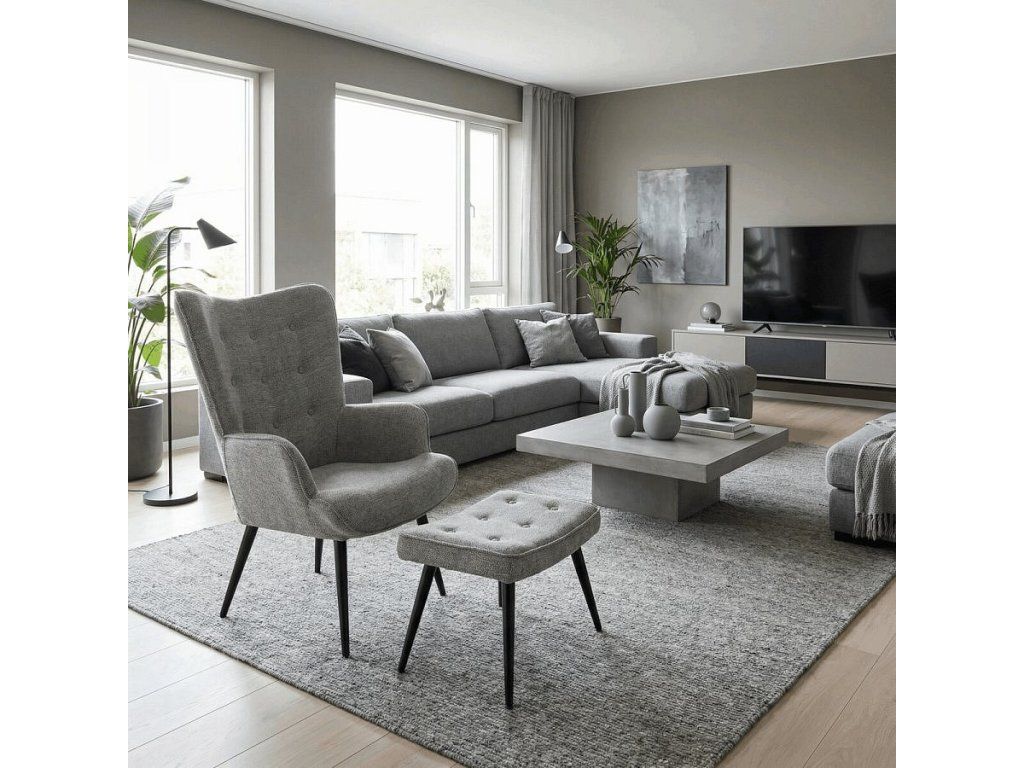 Relaxační křeslo s podnožkou v šedé barvě je potažené vodoodpudivou prémiovou látkou, která usnadňuje údržbu a zvyšuje odolnost proti polití. Pevná kovová podnož v černém provedení zajišťuje stabilitu a dlouhou životnost. Křeslo disponuje pohodlnými čalouněnými područkami a ergonomicky tvarovaným opěradlem s decentním prošitím, které podporuje relaxaci a komfort při sezení. Součástí je také samostatný taburet se stejným materiálem a designem, který umožňuje pohodlné opření nohou. Tento set je vhodný pro odpočinek v obývacím pokoji či pracovně, kde oceníte kombinaci funkčnosti a moderního vzhledu. Taburet je o šířce 48cm, hloubce 38cm a výšce 36cm.