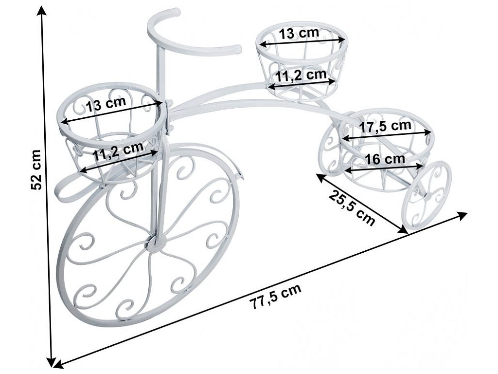 Materiál: kov Barva: bílá Rozměry (ŠxHxV): 77,5x25,5x52 cm Spodní a horní průměr menších květináčů: 11,2/13 cm Spodní a horní průměr většího květináče: 16/17,5 cm V retro stylu Dodávané v monte