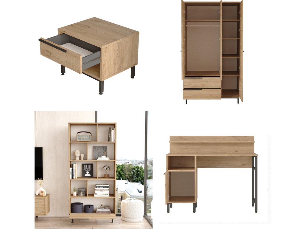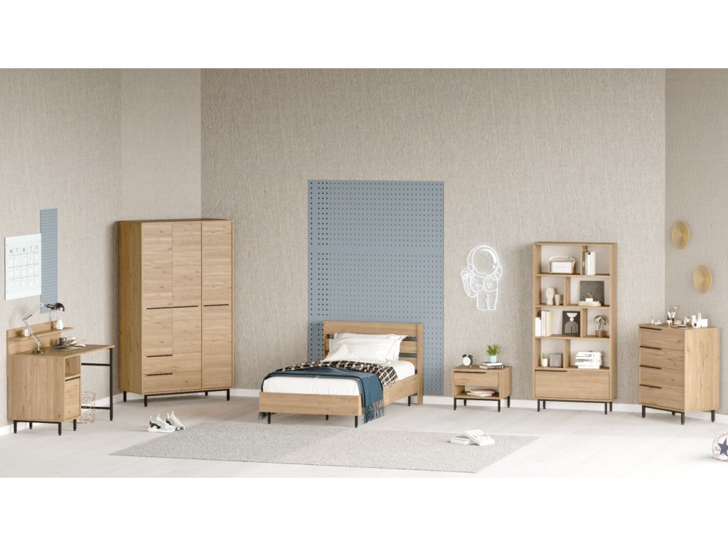 nabízí vše, co vaše dítě potřebuje pro pohodlí, studium a zábavu. Postel poskytuje komfortní místo pro spánek, noční stolek je praktický pro lampičku nebo knihy, šatní skříň zajistí dostatek prostoru pro oblečení, psací stůl je ideálním místem pro učení a tvoření, zatímco knihovna poskytuje prostor pro knihy, hračky nebo dekorace. Sestava je navržena tak, aby vytvořila harmonický a funkční prostor.