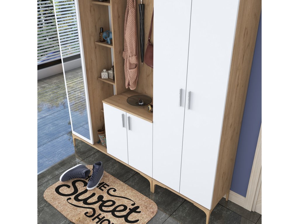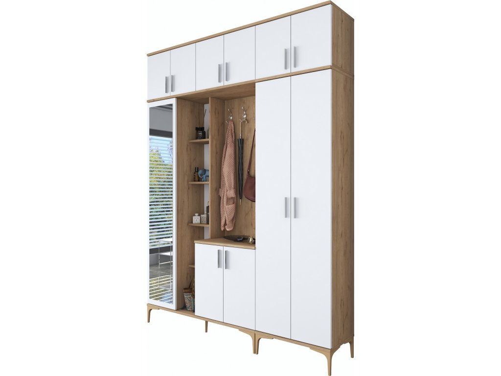 Předsíňová sestava je dokonalou kombinací elegance a funkčnosti. S moderním designem v bílé barvě s ořechovým dekorem dodává vaší předsíni útulný a organizovaný vzhled. Ideální volba pro každý domov!