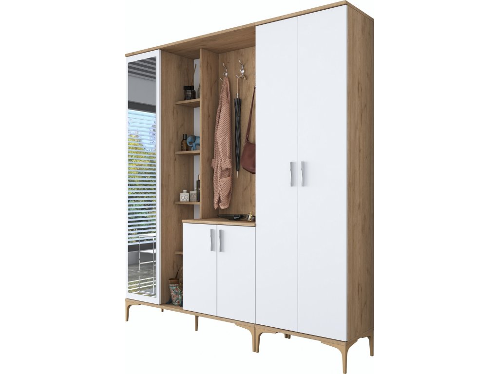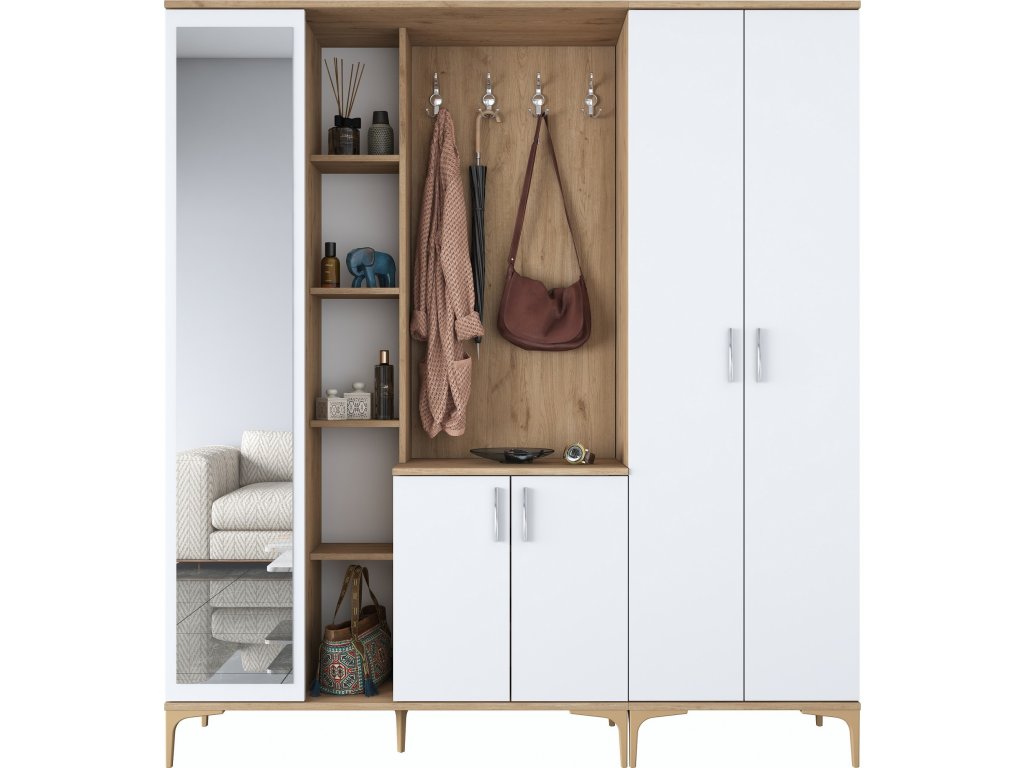 Sestava zahrnuje skříň se zrcadlem, která opticky zvětšuje prostor a umožňuje rychlou kontrolu vzhledu před odchodem. Skříňka na boty poskytuje praktické řešení pro uložení obuvi, zatímco věšáky a šatní skříň umožňují snadné uspořádání kabátů, bund a doplňků.