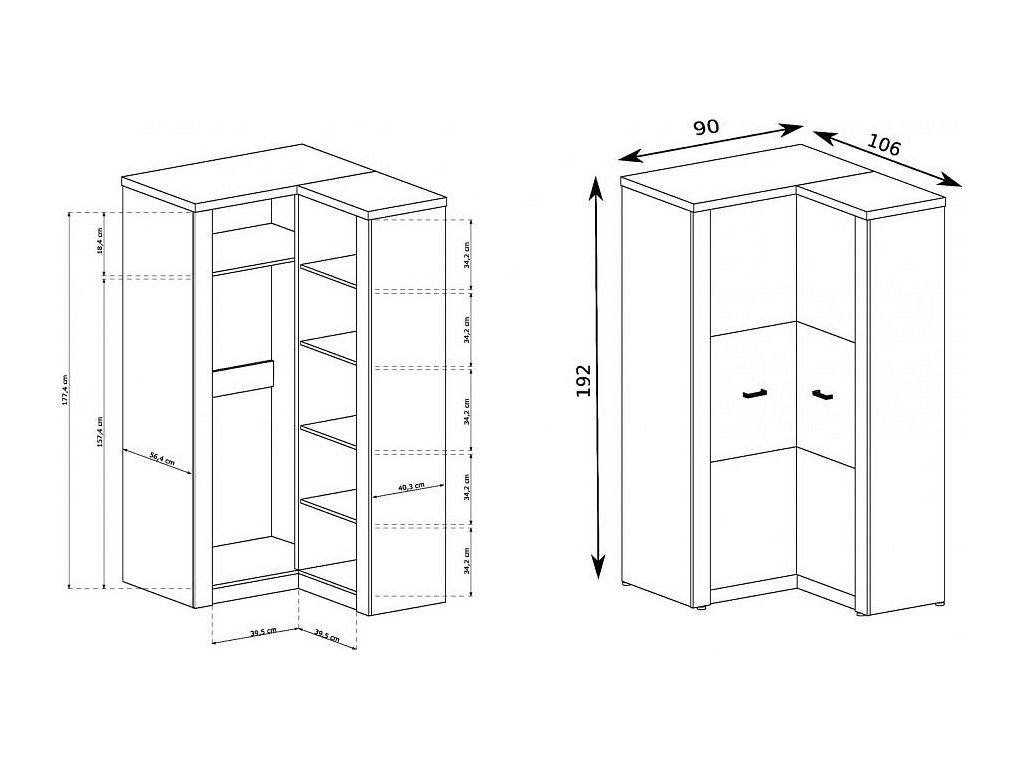 CASA 71007 Rohová šatní skříň s rohem napravo. Roh napravo znamená (viz hlavní obrázek), že nalevo je volný prostor se šatní tyčí a vpravo jsou 4 police (podrobné rozměry viz perokresba). Systém je exkluzivní kolekce navržena v moderním duchu. Celá řada se vyznačuje elegancí a jednoduchými tvary, které zaručují plné využití prostoru. Nábytek je vyroben z kvalitního lamina s ABS hrany ( 0,5-0,8 mm ). Barevné provedení jasan světlý. Dodáváme v demontovaném stavu.