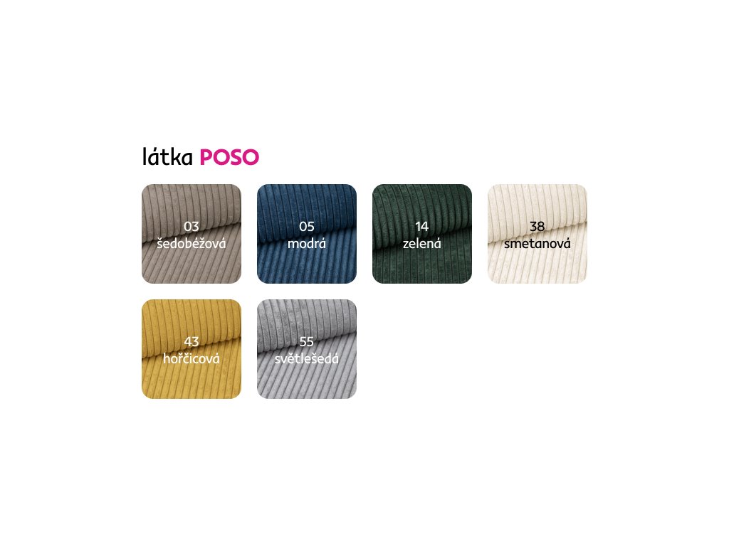 Nabízíme vám možnost vybrat si ze 6 barevných provedení látky Poso za cenu 26 290 Kč. Při individuální objednávce je třeba zaplatit 20% zálohu z dané částky.