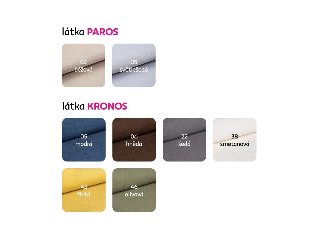 Nabízíme vám možnost vybrat si ze 6 barevných provedení látky Kronos nebo ze 2 barevných provedení látky Paros za cenu 26 690 Kč. Při individuální objednávce je třeba zaplatit 20% zálohu z dané částky. Po uhrazení zálohy bude Váš požadavek zadán do výroby. Dodací lhůta 6-8 týdnů.