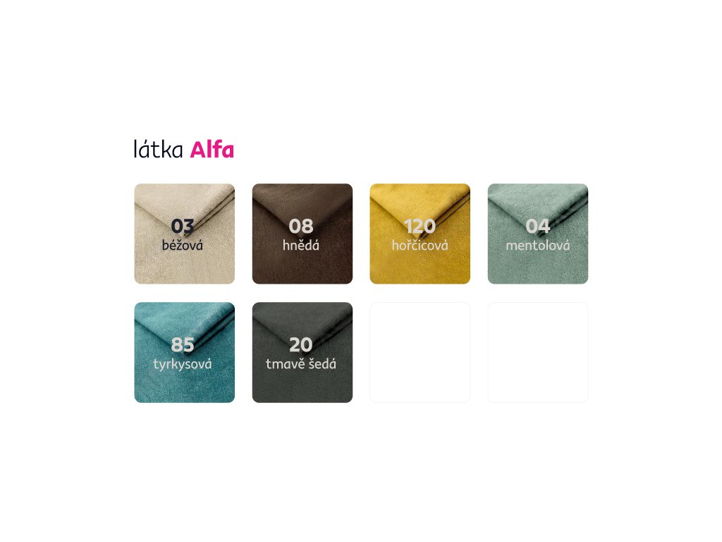 Možnost objednat v 6 barevných provedeních látky Alfa v ceně 22.790 Kč. Při individuální objednávce je třeba zaplatit 20% zálohu z dané částky. Po uhrazení zálohy bude Váš požadavek zadána do výroby. Doba dodání 6-8 týdnů.