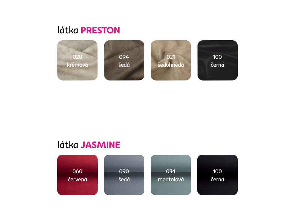 Máme pro vás hned čtyři barvy látky Preston a čtyři barvy látky Jasmine, kombinovat tedy můžete dle libosti. Cena sedačky na individuální objednávku je 39.790 Kč. Při individuální objednávce je třeba zaplatit 20% zálohu z dané částky. Po uhrazení zálohy bude Váš požadavek zadána do výroby.
