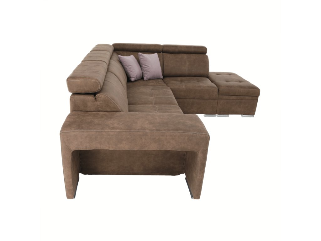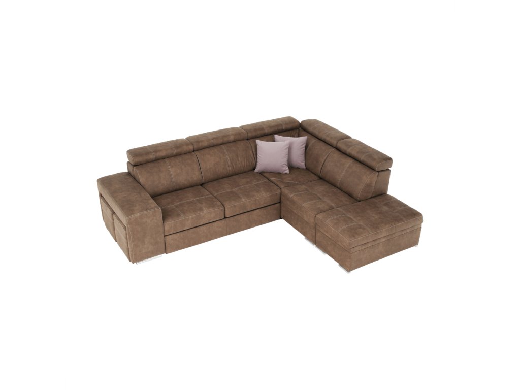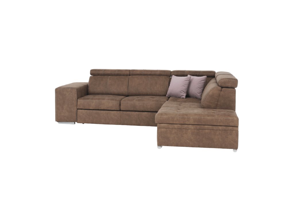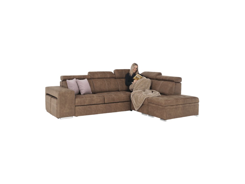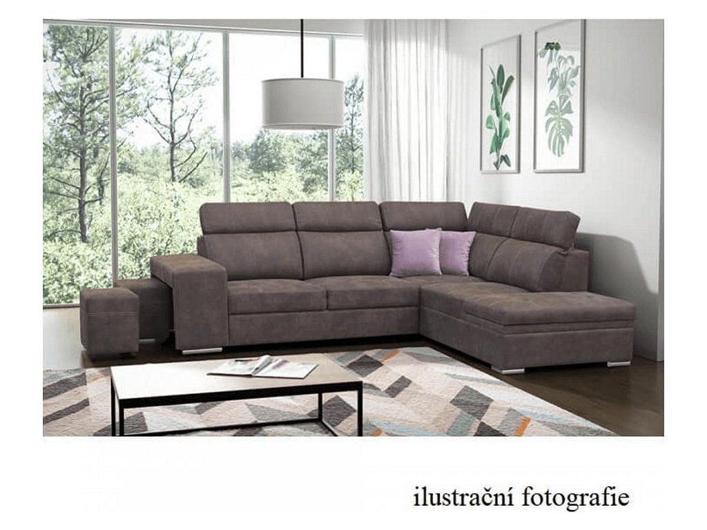 Celočalúnená rohová rozkladacia sedacia súprava s úložným priestorom a s polohovacím záhlavím.