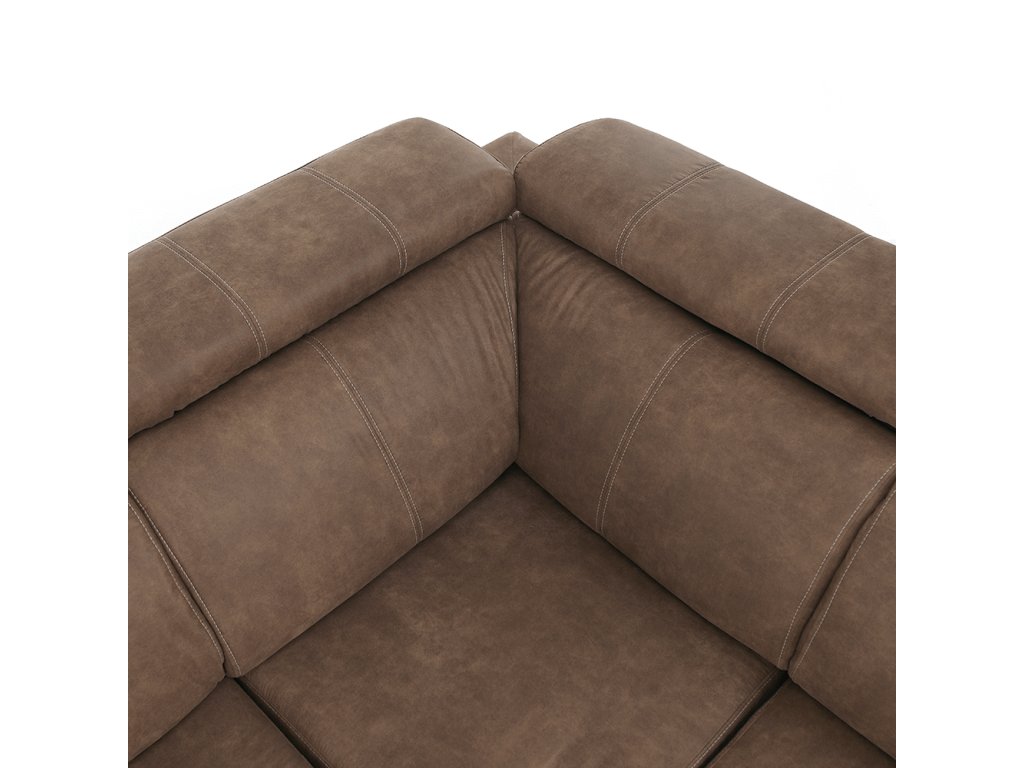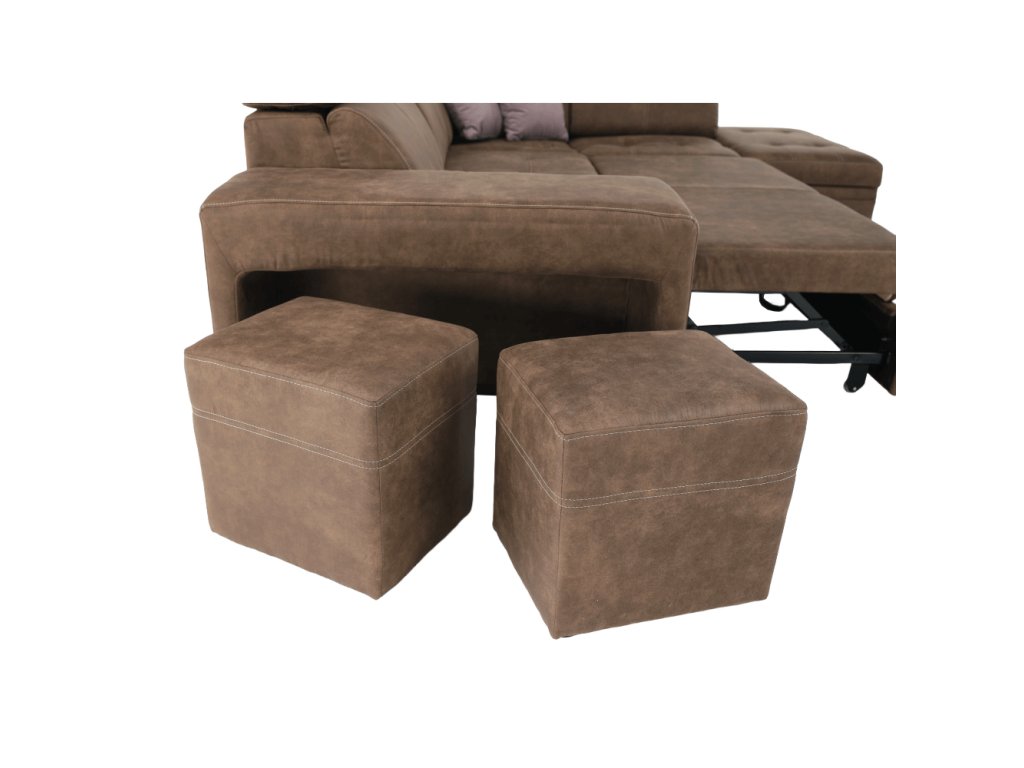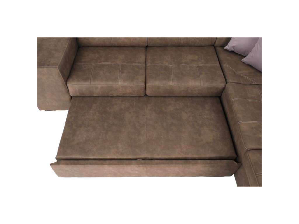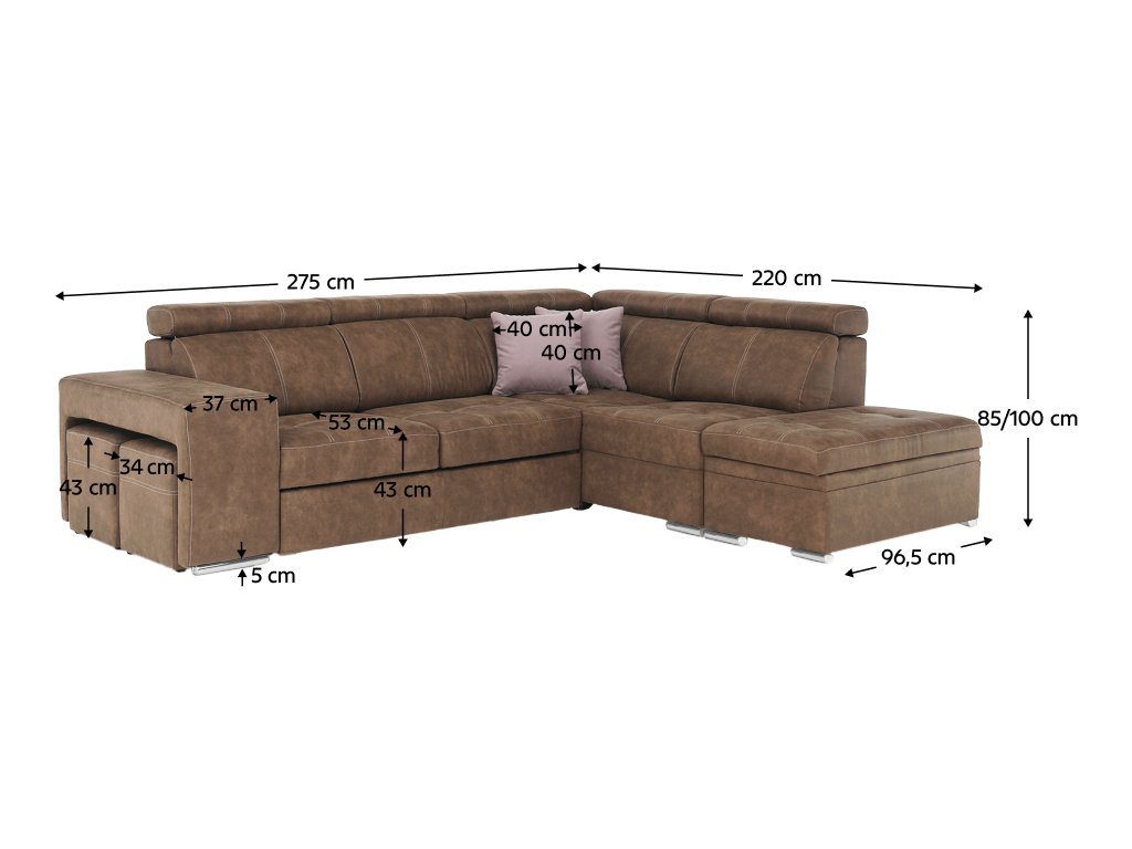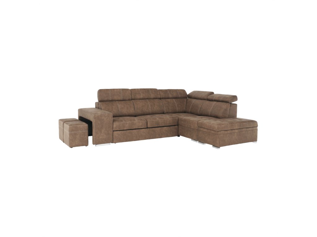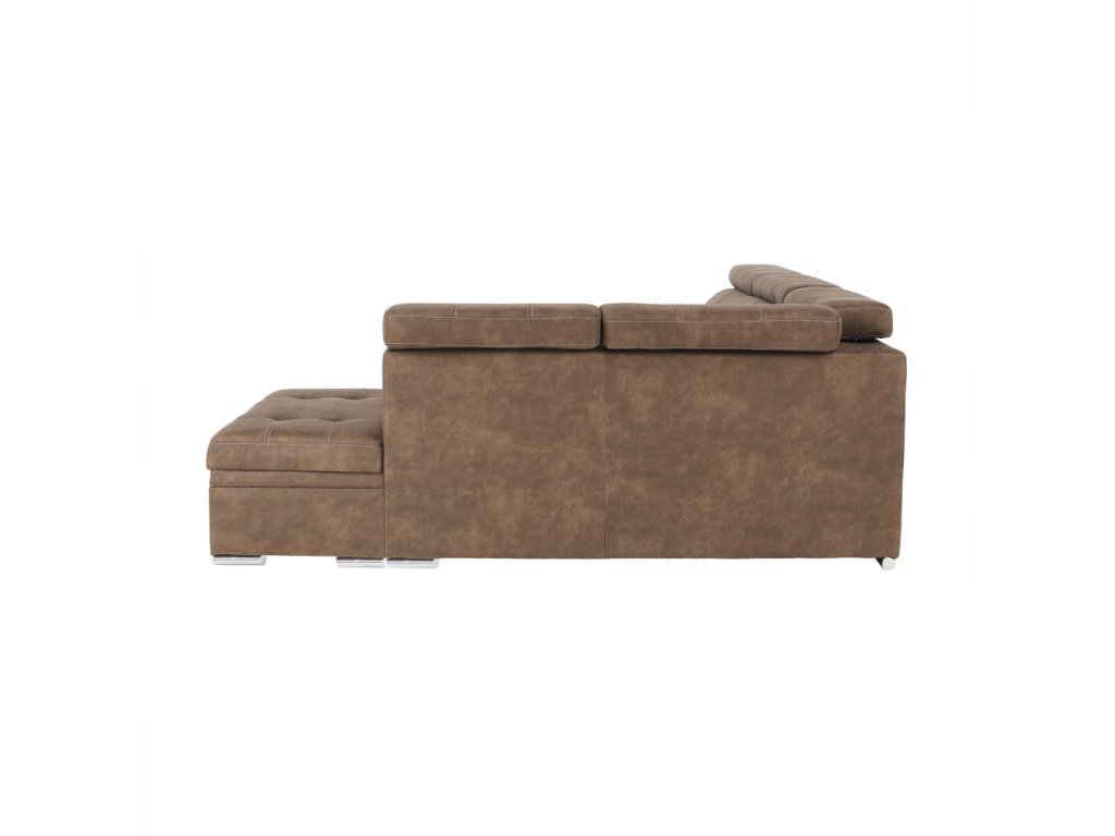 Celočalúnená rohová rozkladacia sedacia súprava s úložným priestorom a s polohovacím záhlavím.
