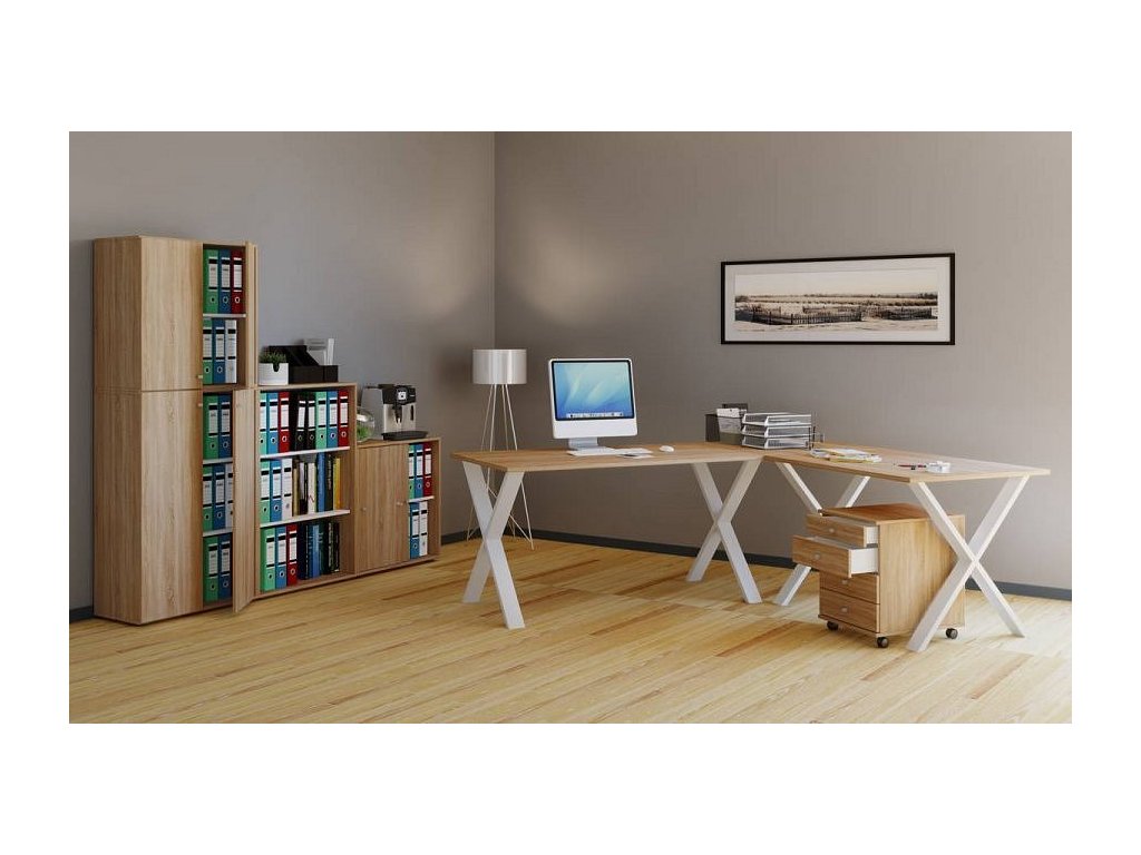 Hlavní vlastnosti: - Nohy stolu ve tvaru X z exkluzivního kovu - Stabilní a vysoce kvalitní zpracování - Replika dřevěné konstrukce - Stůl v různých barvách a rozměrech Rohový stůl VCM "Lona WH" v imitaci dřevěné struktury je stůl se speciálními designovými požadavky. Nábytek lze rychle a snadno sestavit pomocí přiloženého montážního návodu. Důraz na detail dělá z nábytku VCM něco velmi speciálního. K dispozici jsou další kancelářské skříňky a mobilní podstavce ze série "VCM Lona", které ladí se stolem.