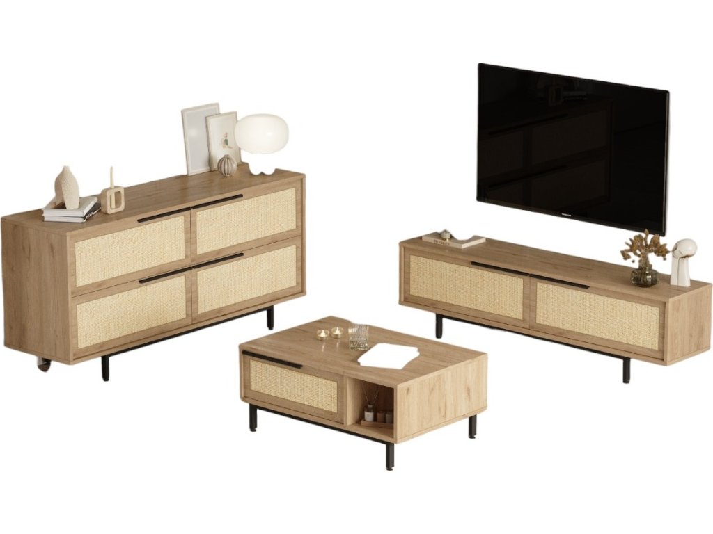 spojuje funkčnost a moderní design. Televizní stolek nabízí prostor pro elektroniku a multimediální zařízení, konferenční stolek je ideálním doplňkem pro odkládání občerstvení nebo dekorací a prostorná komoda poskytuje dostatek úložného prostoru pro organizaci vašich věcí. Díky preciznímu zpracování a elegantnímu vzhledu se tato sestava stane středobodem vašeho obývacího pokoje.
