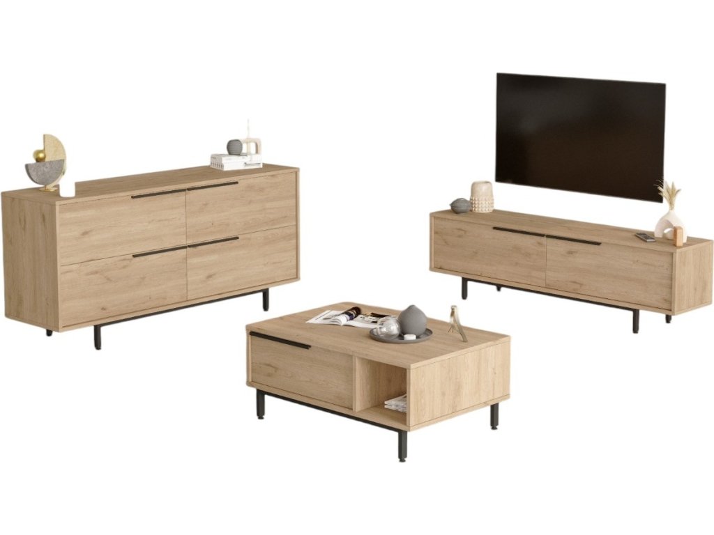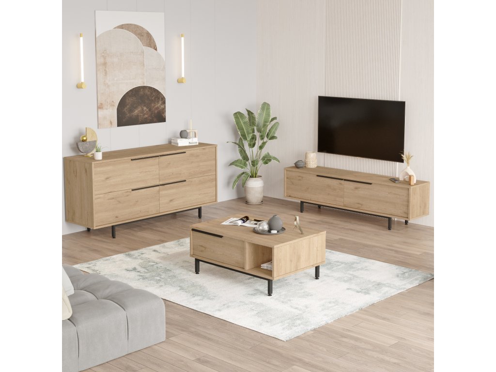 spojuje funkčnost a moderní design. Televizní stolek nabízí prostor pro elektroniku a multimediální zařízení, konferenční stolek je ideálním doplňkem pro odkládání občerstvení nebo dekorací a prostorná komoda poskytuje dostatek úložného prostoru pro organizaci vašich věcí. Díky preciznímu zpracování a elegantnímu vzhledu se tato sestava stane středobodem vašeho obývacího pokoje.