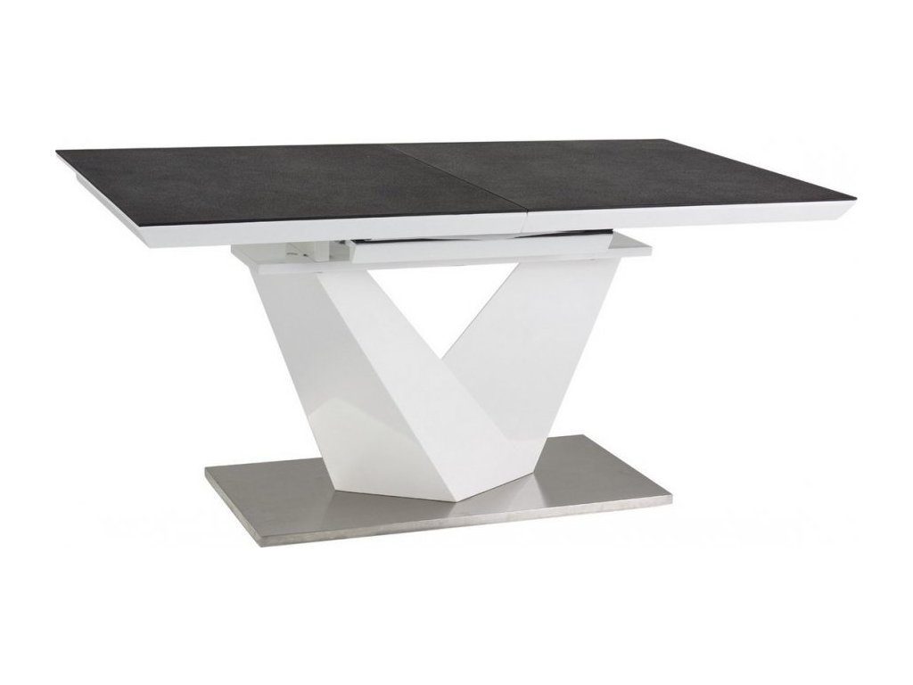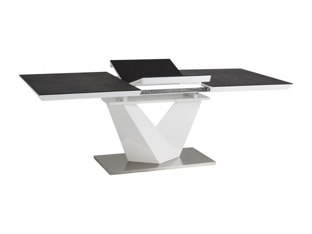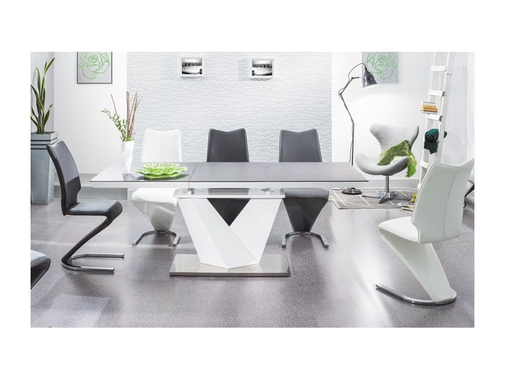 CASA 11088 Moderní jídelní rozkládací stůl vyrobený z kvalitní MDF v bílé barvě. Podstavec je z leštěné oceli, deska stolu je bílý lesk v kombinaci s vroubkovaným tvrzeným sklem šedočerné barvy. Plocha stolu před rozložením je 80 x 120 cm, po rozložení 80 x 180 cm. Stůl je určen až pro 8 osob. K tomuto stolu doporučujeme židle v naší nabídce.