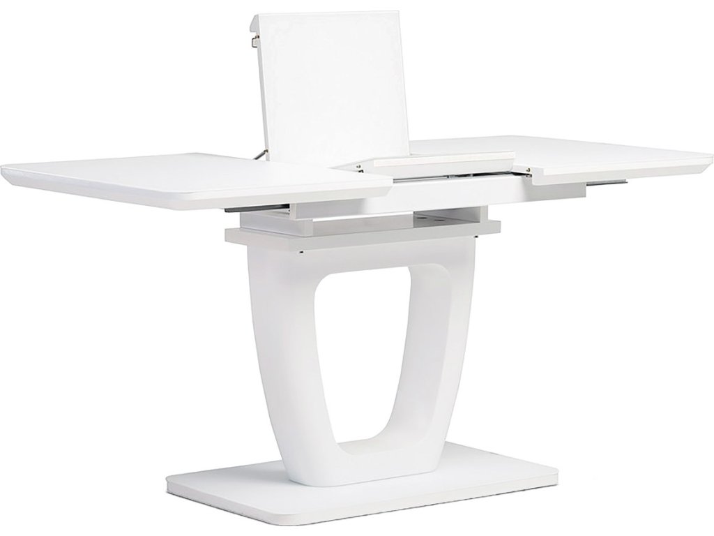 Designový jídelní rozkládací stůl o rozměru 110 + 40 x 75 cm. Vrchní stolová deska je tvrzeného skla tl. 4 mm v bílé barvě. Díl rozkladu je také krytý bílým sklem jako celá stolová deska, což nepatří ke standardům a řadí stůl do vyšší kategorie. Podkladová deska, centrální noha je z MDF je čistě bílá v matném provedení. Podesta je z také z MDF a krytá sklem v barvě. Ze spodní části opatřená plastovými kluzáky, eleminujícími poškození povrchů tvrdých podlah. Mechanické součásti jsou kovové. Stůl jistě zaujme svým nadčasovým designem i skvěloým zpracováním detailu a v neposlední řadě i barvou a stane se elegantním prvkem v moderních i klasicky laděných jídelnách, kuchyních a obývacích prostorách. Výška stolu je 76 cm. Ke stolu je možné umístit až 6 židlí.