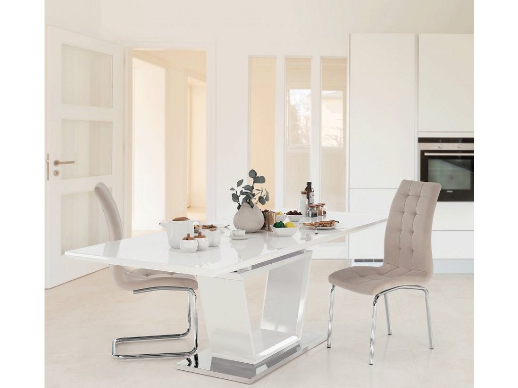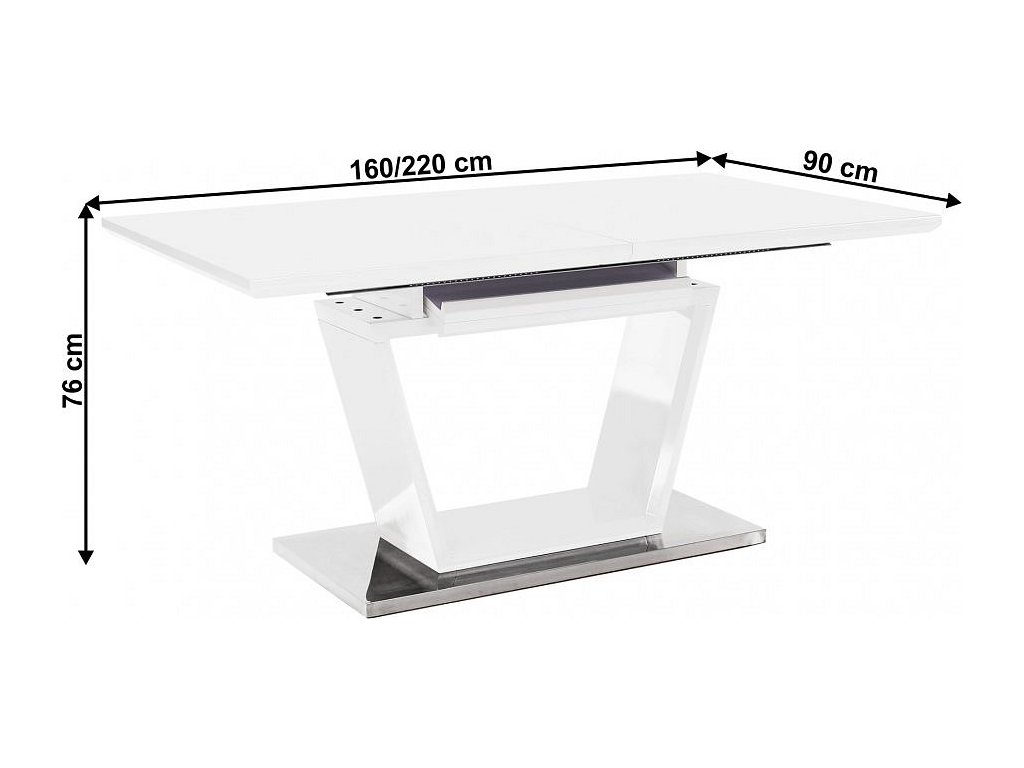 luxusní a designový rozkládací jídelní stůl, barevné provedení: bílá s extra vysokým leskem HG, materiál: MDF + oceľ, ŠxHxV: 160-220x90x76 cm.
