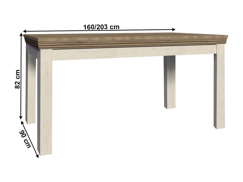 jídelní stůl - rozkládací z elegantního sektorového systému Royal v anglickém stylu, ze kterého si můžete vyskládat nábytek podle Vašich představ krásné jídelny. Stůl můžete MAZ složený s šířkou 160 cm, nebo jej rozložit na šířku až 203 cm. Materiál: korpus DTD laminovaná + ozdobné lišty, kovové úchyty. Barevné provedení: bílá sosna skandinávská v kombinaci s dubem divokým. Rozměry ŠxVxH: 160-203x82x90 cm. Tloušťka materiálu: 22 mm. Dodáváno v demontu.