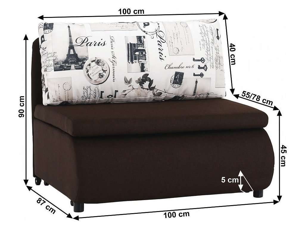 Rozkládací křeslo KENY NEW s úložným prostorem je vyrobena v potahové látce Savana 16 hnědá/vzor. Křeslo se rozloží vysunutím sedáku a překlopením opěráku. Tímto vznikne plocha na spaní. Úložný prostor je umístěn pod sedákem.