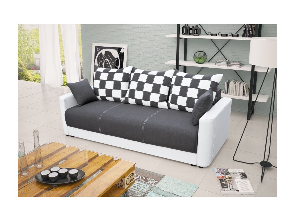 Moderní rozkládací pohovka s úložným prostorem. Výplň pohovky tvoří pružiny bonell a faliste v kombinaci s kvalitní PUR pěnou. Jednoduchým rozkladem pomocí automatu vznikne lůžko vhodné k příležitostnému spaní. Pohovku dodáváme v několika barevných provedeních, které také naleznete v naší nabídce. Rozpis rozměrů najdete na přiloženém obrázku s nákresem. V ceně pohovky jsou 3 velké kostkované polštáře a 2 malé polštáře v barvě pohovky. Ostatní vyobrazené dekorace nejsou v ceně.