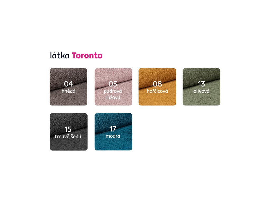 Možnost objednání v 6 barevných provedeních látky Toronto za cenu 40.790 Kč. Při individuální objednávce je třeba zaplatit 20% zálohu z dané částky. Po uhrazení zálohy bude Váš požadavek zadán do výroby. Dodací lhůta 6-8 týdnů.
