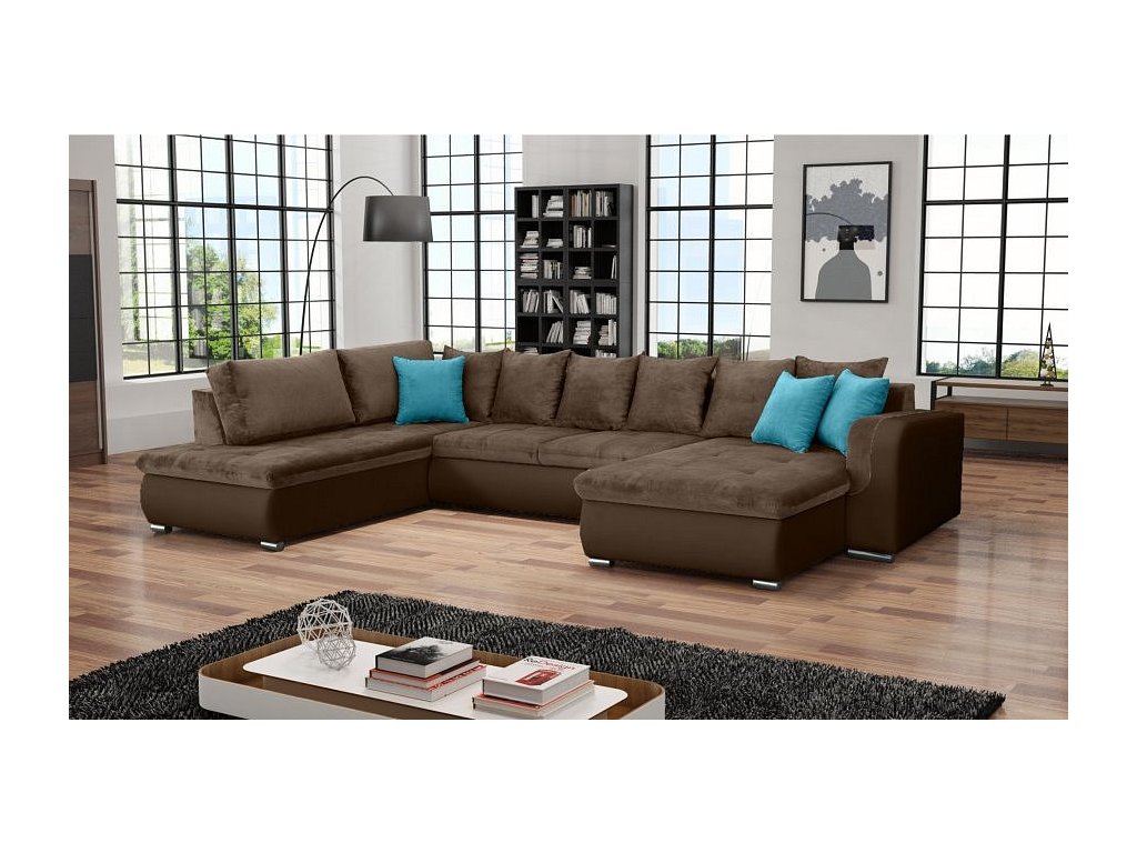 CASA 41005 Praktická prostorná celočalouněná rohová sedačka do tvaru U. Netradiční a velmi moderní vzhled. Sedačka obsahuje prostor na příležitostní spaní. Po rozložení je spací plocha 285 x 135 cm. Rozklad je snadný, vysune se vozík s matrací do přední části. Pohodlné sezení zaručují vlnovcové pružiny spolu s PUR pěnou ( T30 ). Výška sedu je 41 cm, hloubka sedu 48 cm ( bez polštářů 63 cm ), výška sedačky bez polštářů 65 cm. Nožky jsou kovové pochromované. Barevné provedení - korpus ekokůže Madryt 128, sedací a opěrná část látka Orinoco 29 a dekorační polštářky Orinoco 85.