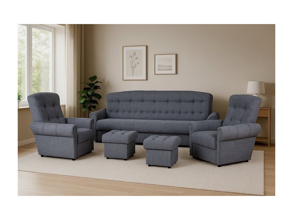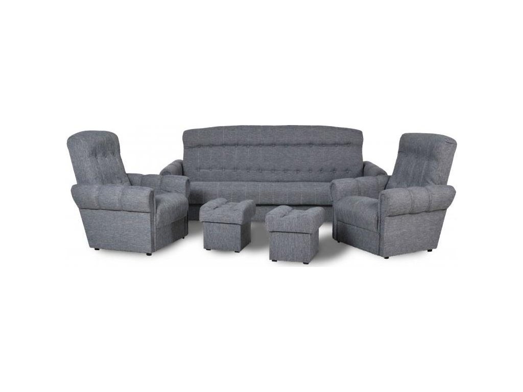 Klasická sedací souprava v šedé barvě je velice oblíbená. Je rozkládací a součástí je praktický úložný prostor. Svou kombinací trojsedu, dvou křesel a dvou taburetů je vhodná i pro vícečlennou rodinu. Trojsed lze jednoduše rozložit stylem klik/klak a tím poslouží k občasnému přespání. Po rozložení vznikne plocha pro spaní 188 cm x 120 cm. Sedáky jsou z PUR pěny, která zajistí pohodlné sezení a vyšší opěrky ocení především starší lidé. Taburety mají také úložný prostor. Nosnost sedací soupravy do 120 kg. Dodáno v demontu.