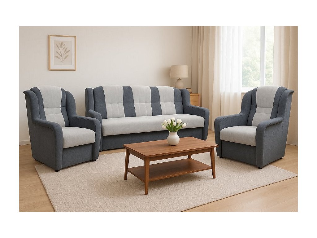 Ušák je stále velmi oblíbeným klasickým modelem sedací soupravy v provedení 3F+1+1. Je velmi pohodlná a zároveň praktická. Sedací souprava je rozkládací a samozřejmostí je i úložný prostor. Jednoduchým rozkladem pomocí systému "klik klak" vznikne lůžko k příležitostnému přespání Vaší návštěvy. Sedací souprava je potažena kvalitní látkou a nabízíme ji v několika barvách, ze kterých si určitě vyberete tu nejvhodnější pro Váš obývací pokoj. Výplň sedáků tvoří pružiny v kombinaci s kvalitní PUR pěnou. Tato kombinace zajistí velmi pohodlné sezení. Cena sedací soupravy je uvedena za rozkládací trojsed a dvě křesla.