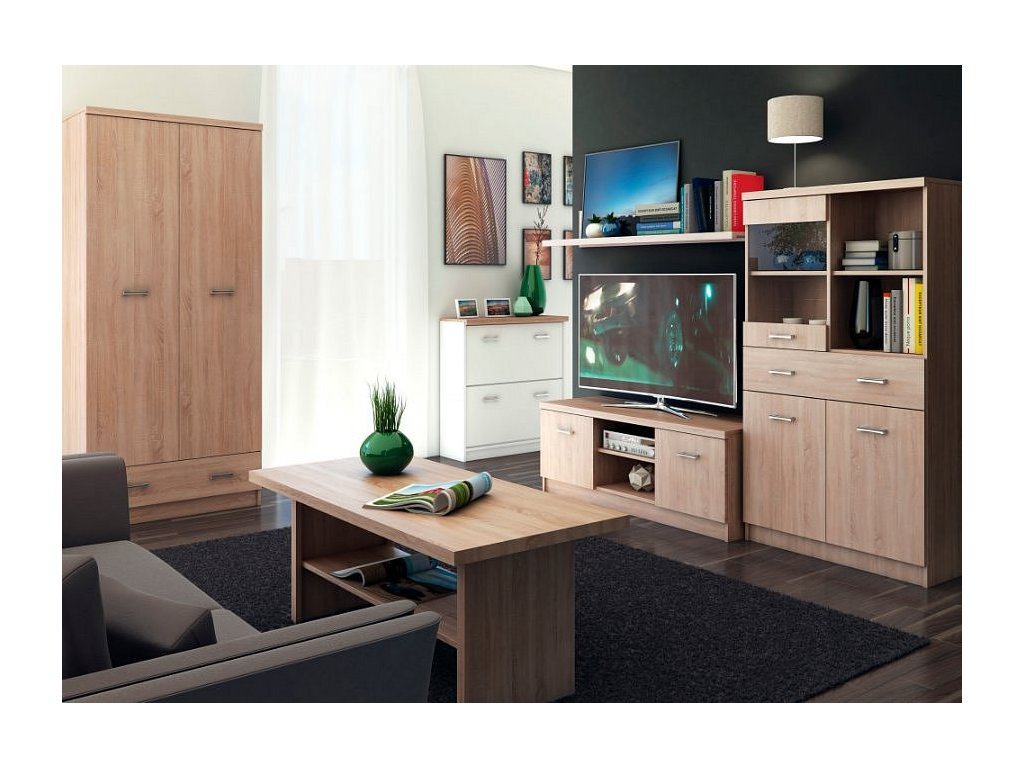 RTV Stolek 2D TOPTY TYP 35 Materiál: DTD laminovaná Barva: dub sonoma Rozměry (ŠxHxV): 120x42x46 cm Dvě skříňky Otevřený úložný prostor Dodáváno v demontu.