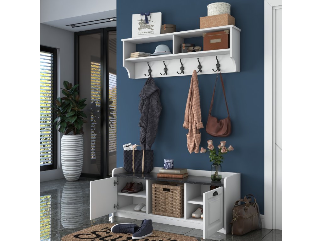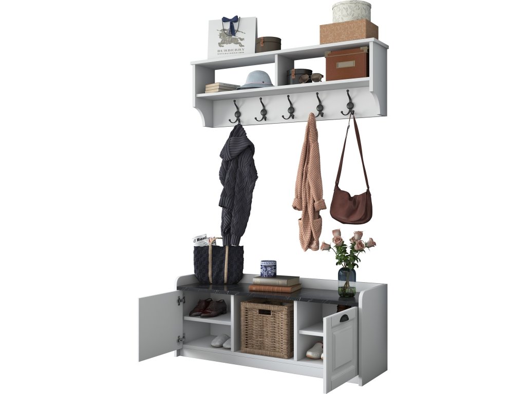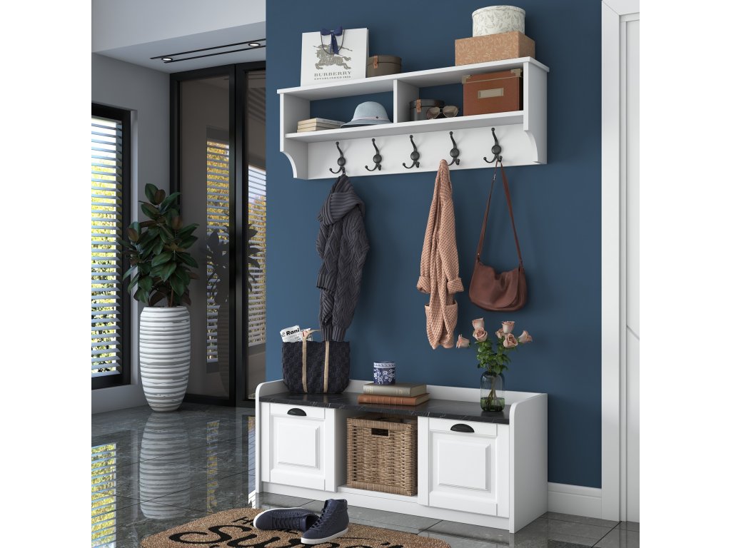 - Závěsný věšák s policí: ideální pro odkládání kabátů, tašek nebo klobouků.