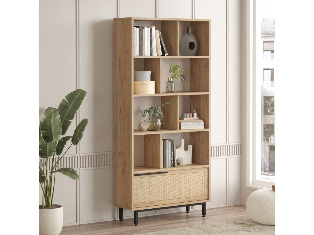 kombinuje praktičnost a moderní styl. Čtyři otevřené police jsou ideální pro vystavení knih nebo dekorací, zatímco plné dvířko poskytuje uzavřený prostor pro uschování dalších předmětů. Díky svému elegantnímu designu a funkčnímu uspořádání se tato knihovna hodí do jakéhokoli obývacího pokoje.